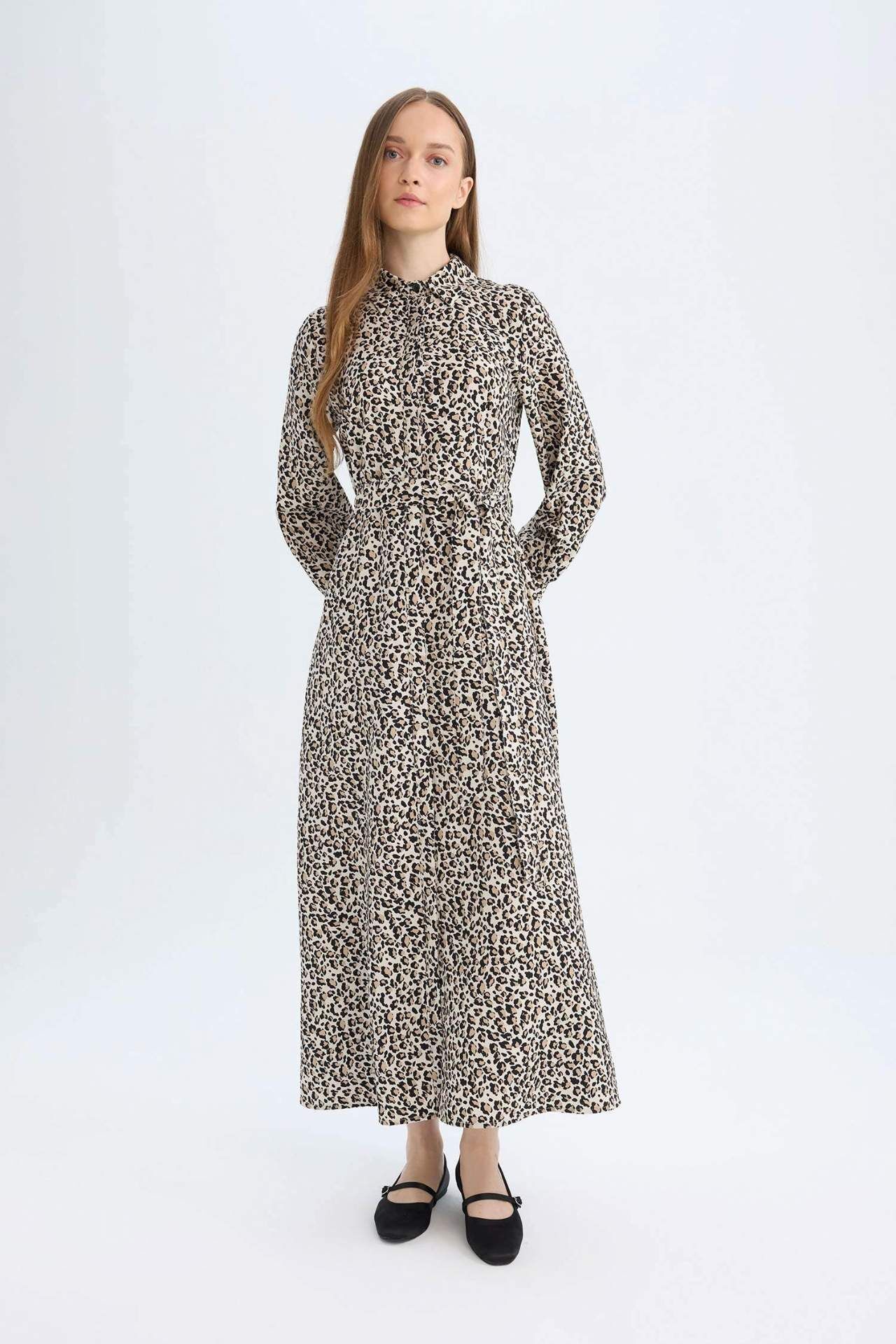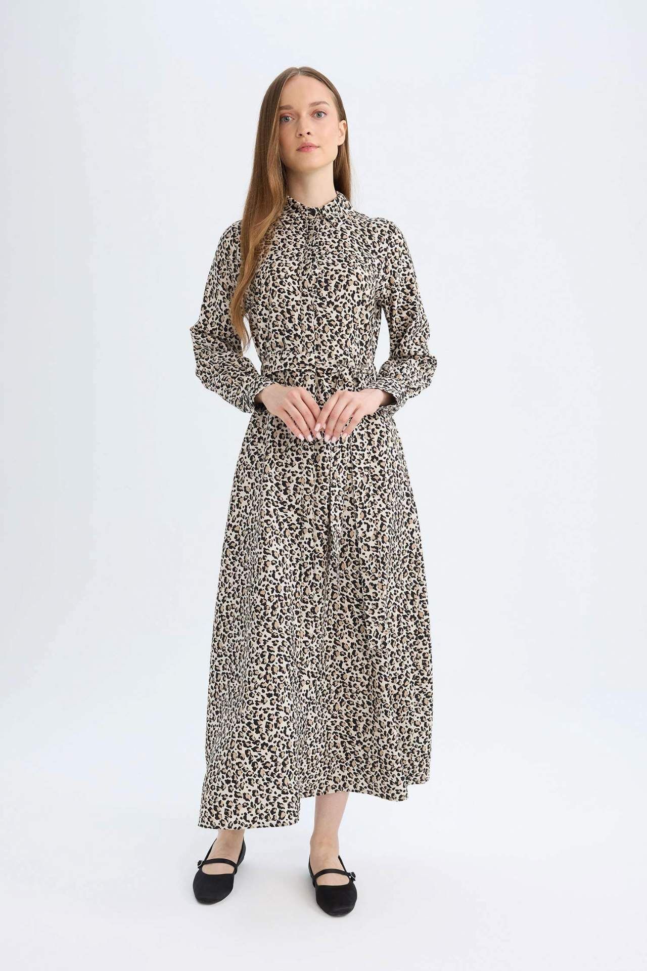 Gömlek Yaka Leopar Desenli Uzun Kollu Maxi Elbise