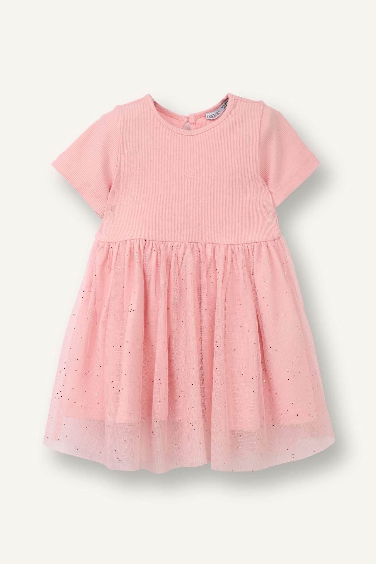 İşlemeli Kısa Kollu Fitilli Kaşkorse Elbise Kız Bebek