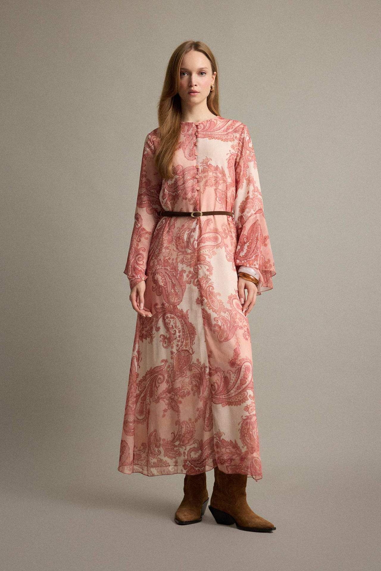 Kaçık yaka ve şal desenli tasarımıyla bohem bir hava sunan bu uzun kollu şifon maxi elbise, zarif ve akıcı duruşuyla dikkat çeker. Kemer detayı bel hattını vurgulayarak feminen bir siluet oluşturur. Poliester 100%,Poliester 100%,Poliester 100%,Poliester 100%,Poliester 100%,Poliester 100%,Poliester 100%,Poliester 100%,Poliester 100%,Poliester 100%,Poliester 100%,Poliester 100%,Poliester 100%,Poliester 100% Manken Bedeni: Göğüs: 84 Boy: 1,74 Basen: 92 Bel: 61