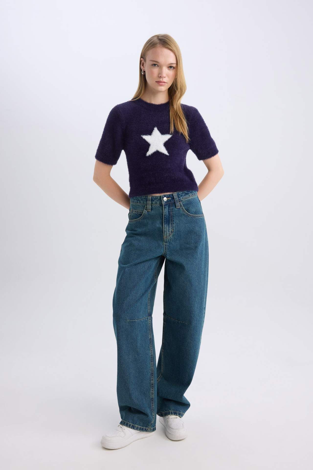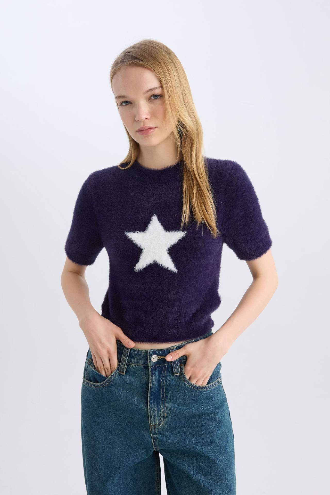 Kadın Lacivert Coool Fitted Bisiklet Yaka Yıldız Baskılı Kısa Kollu Pelüş Kazak