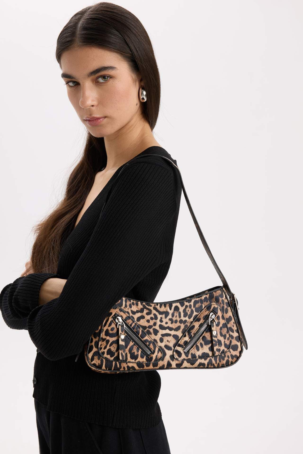 Kadın Leopar Desenli Fermuar Detaylı Omuz Çantası