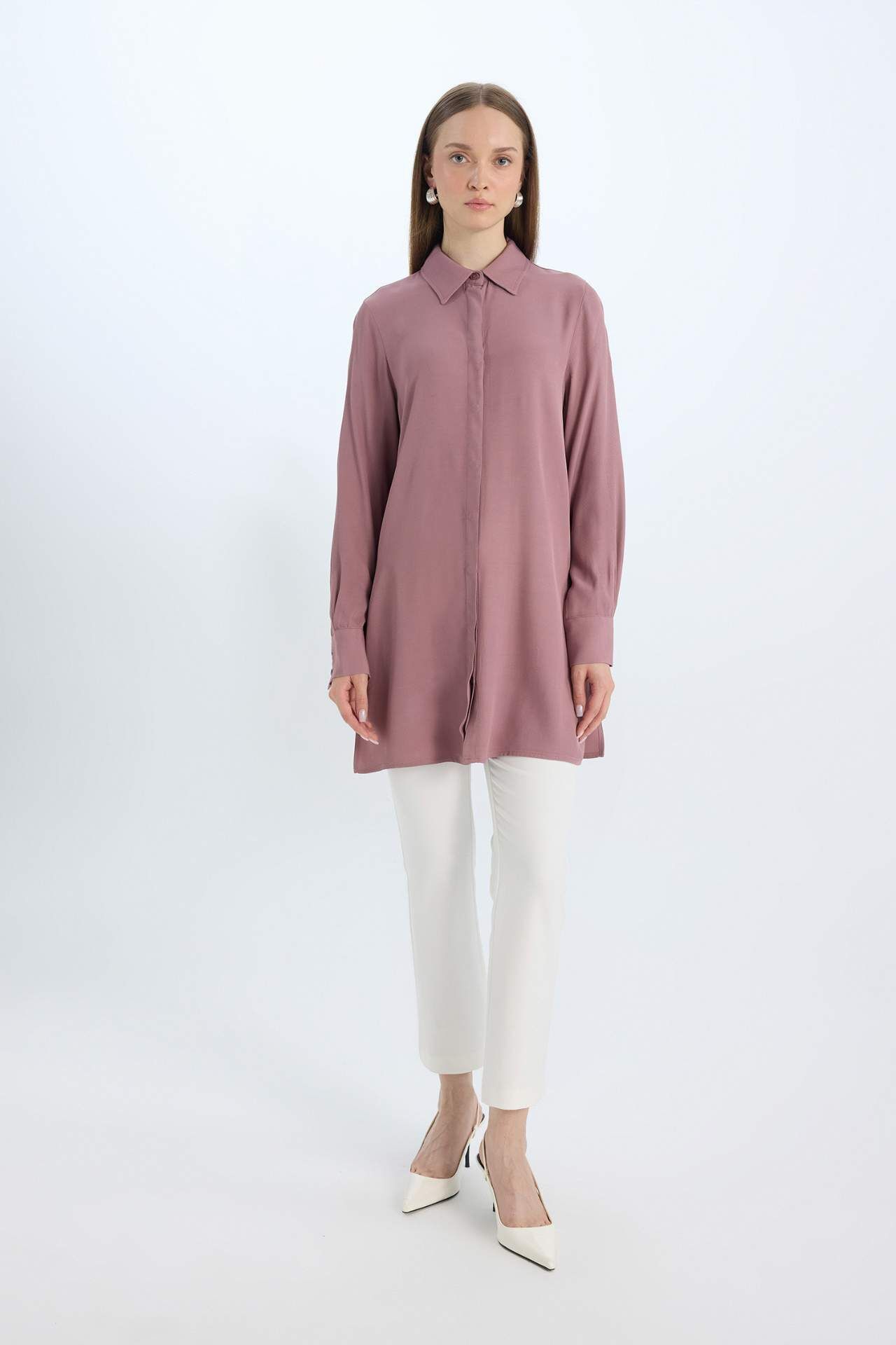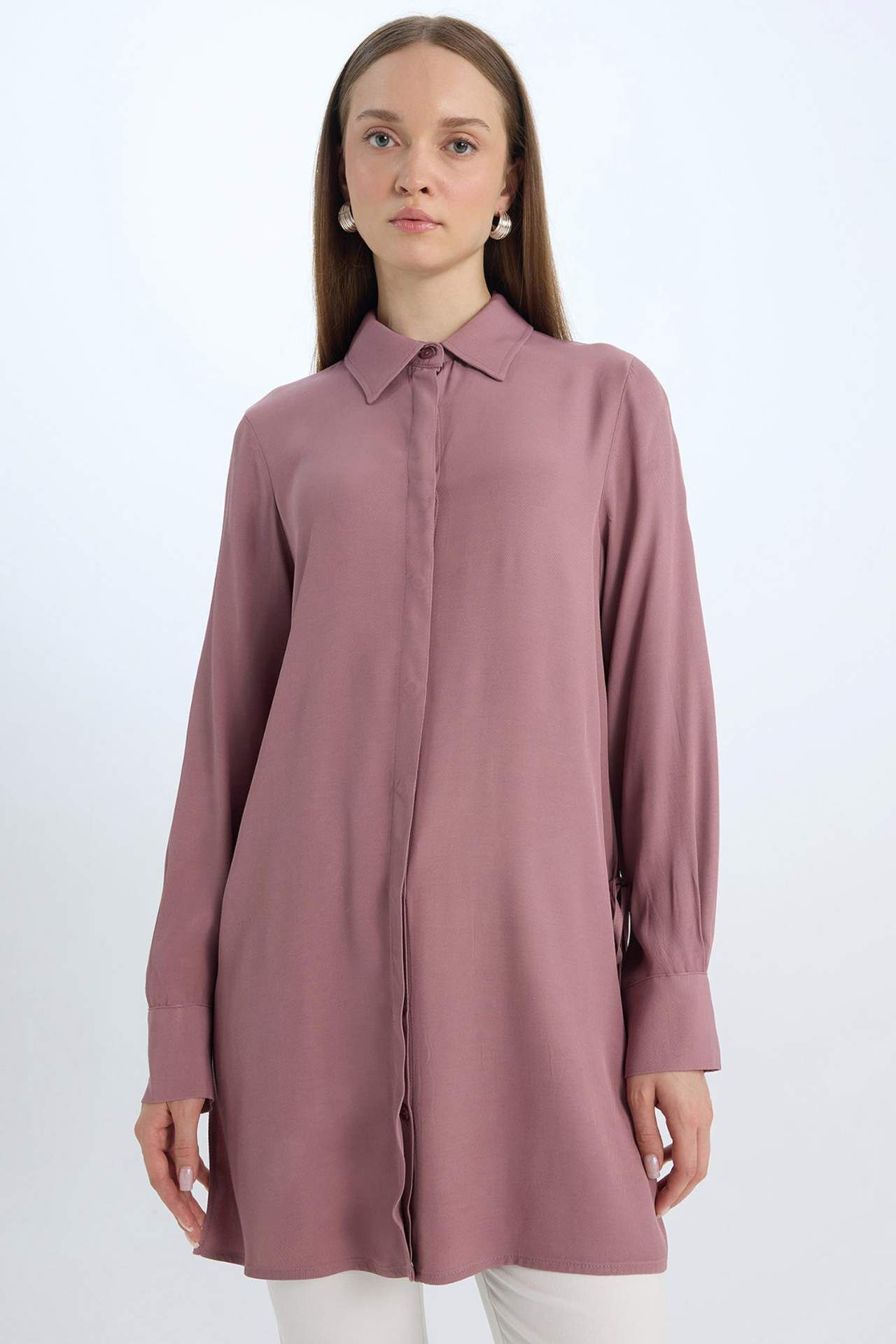 Kadın Relax Fit Gömlek Yaka Yandan Bağlamalı Uzun Kollu Basic Düz Gömlek Tunik
