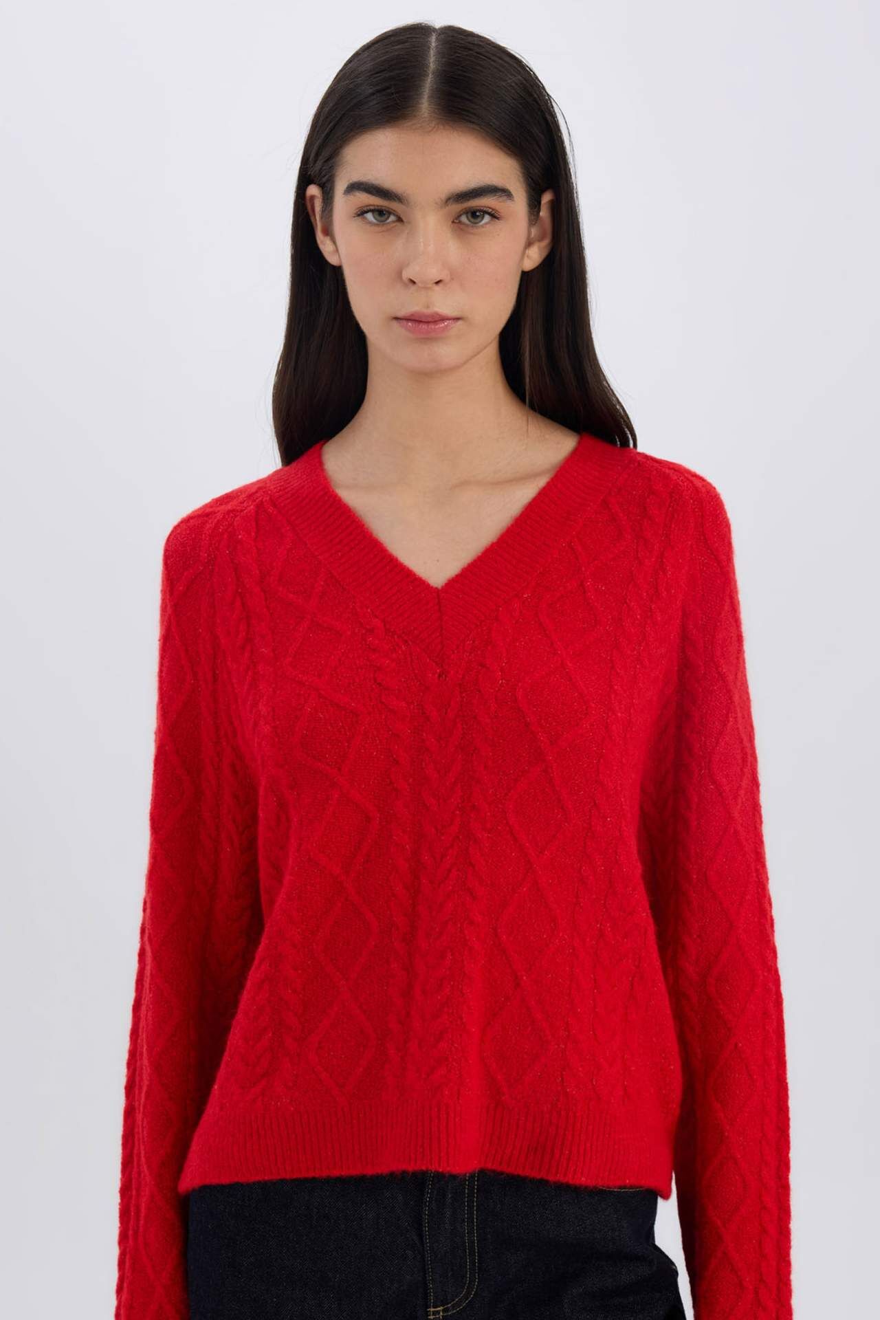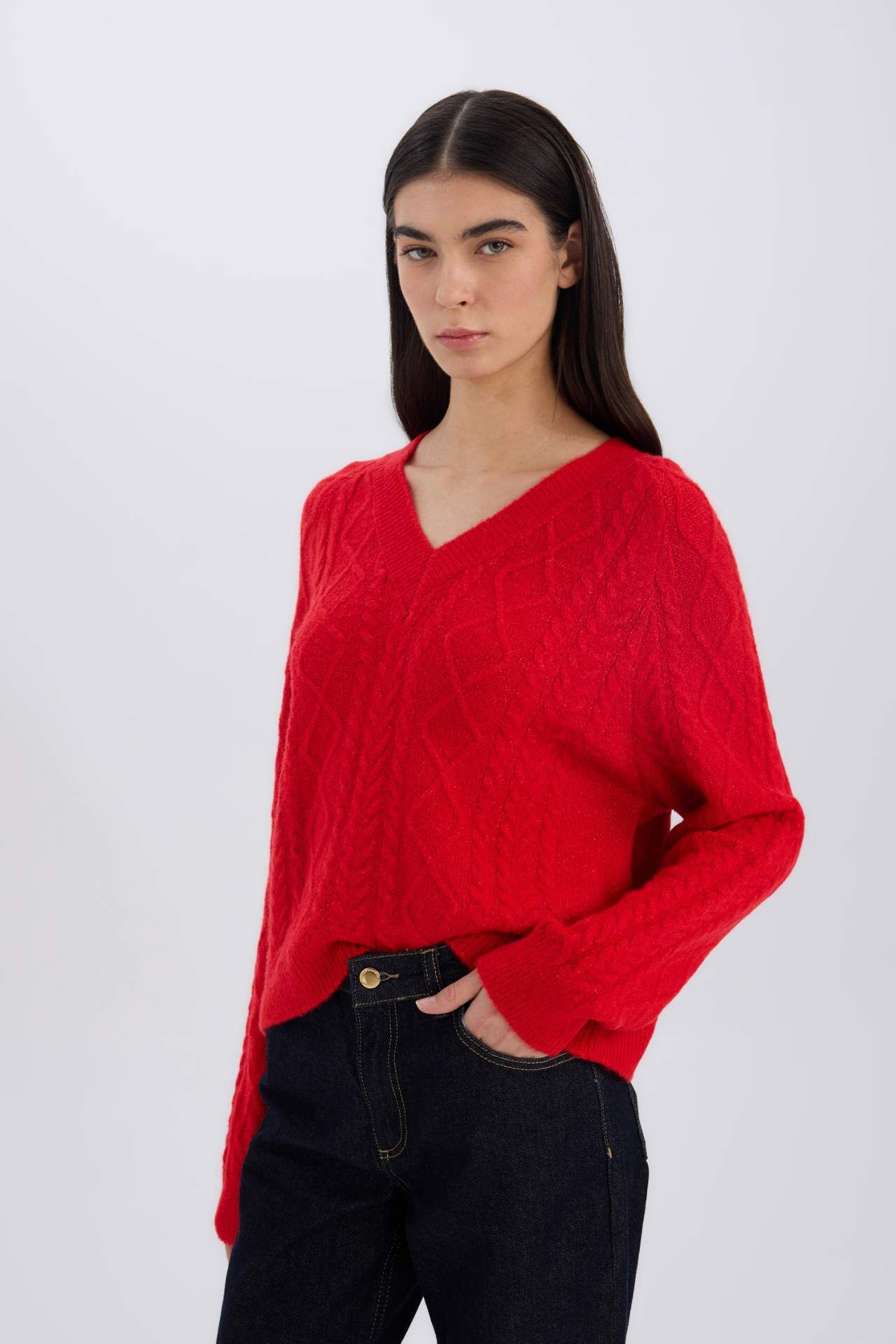 DeFacto Kadın Relax Fit V Yaka Saç Örgülü Triko Kırmızı Kazak
