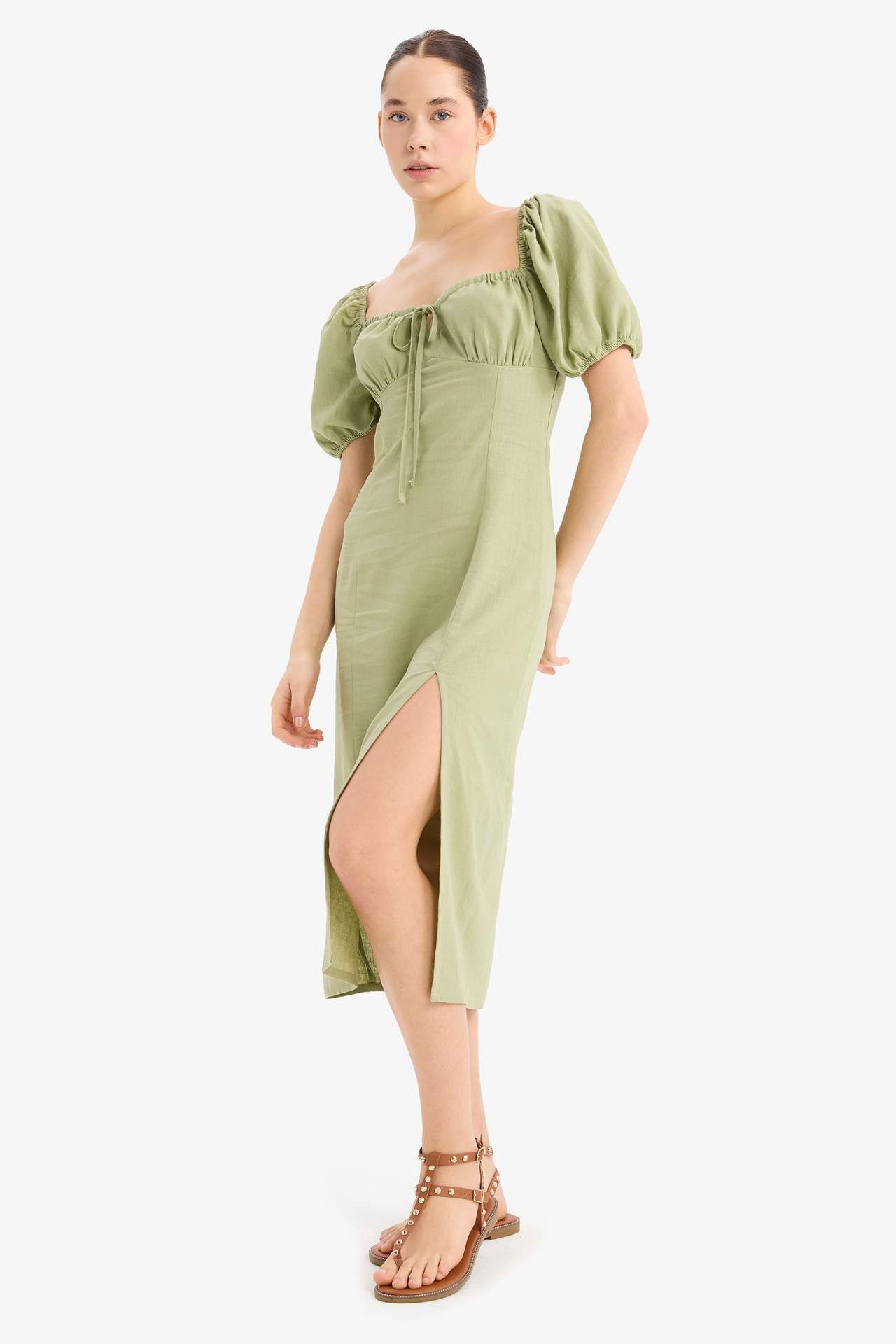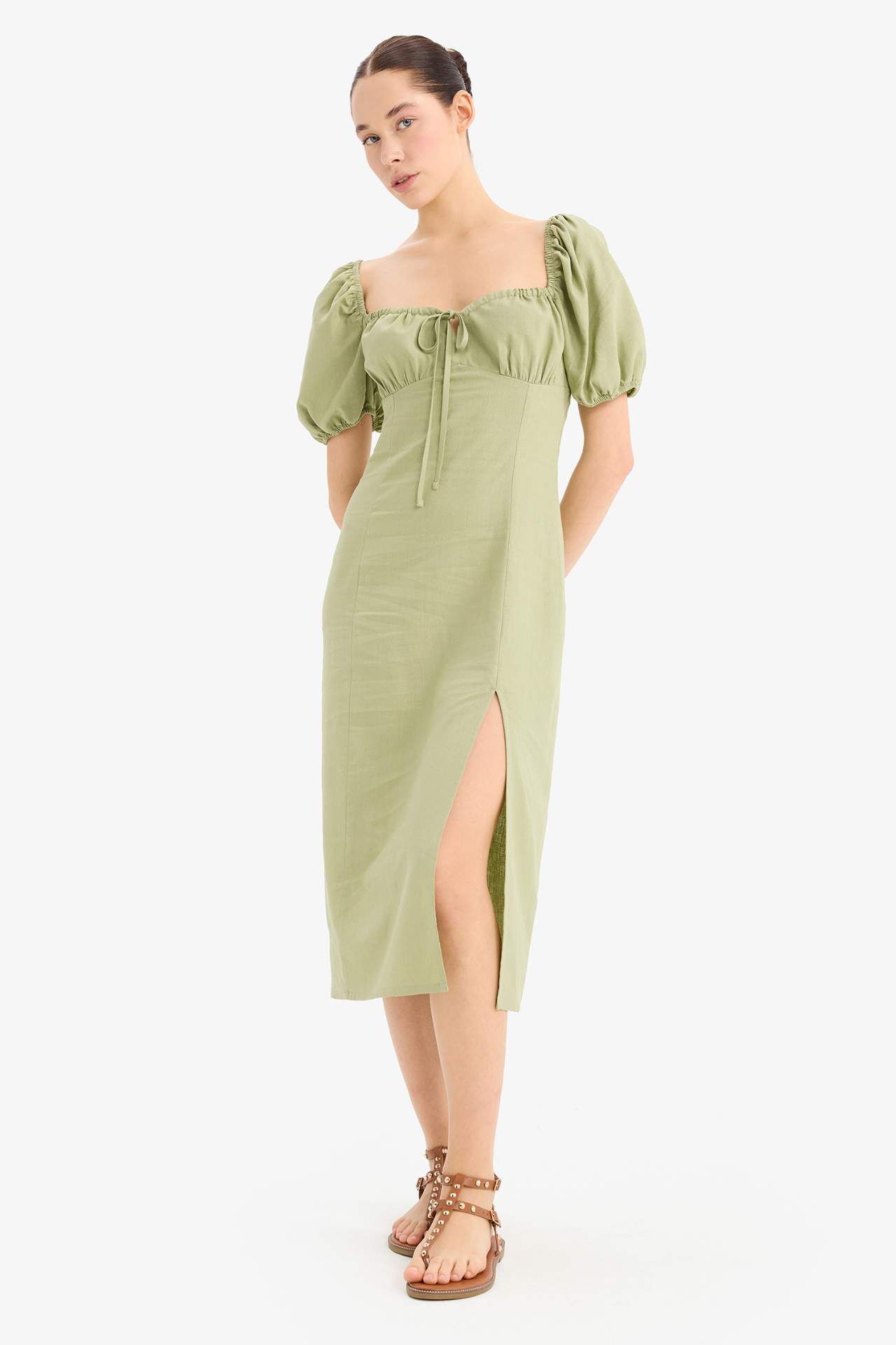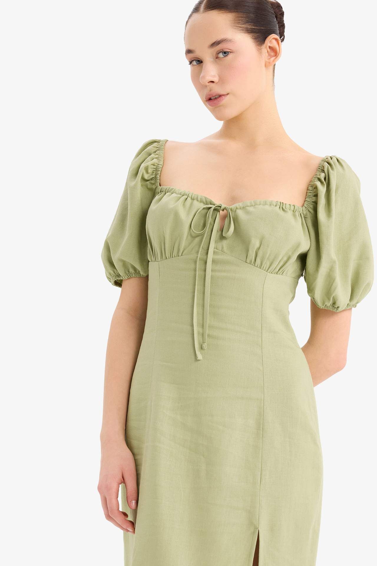 Kalp Yaka Yırtmaçlı Keten Karışımlı Kısa Kollu Midi Elbise