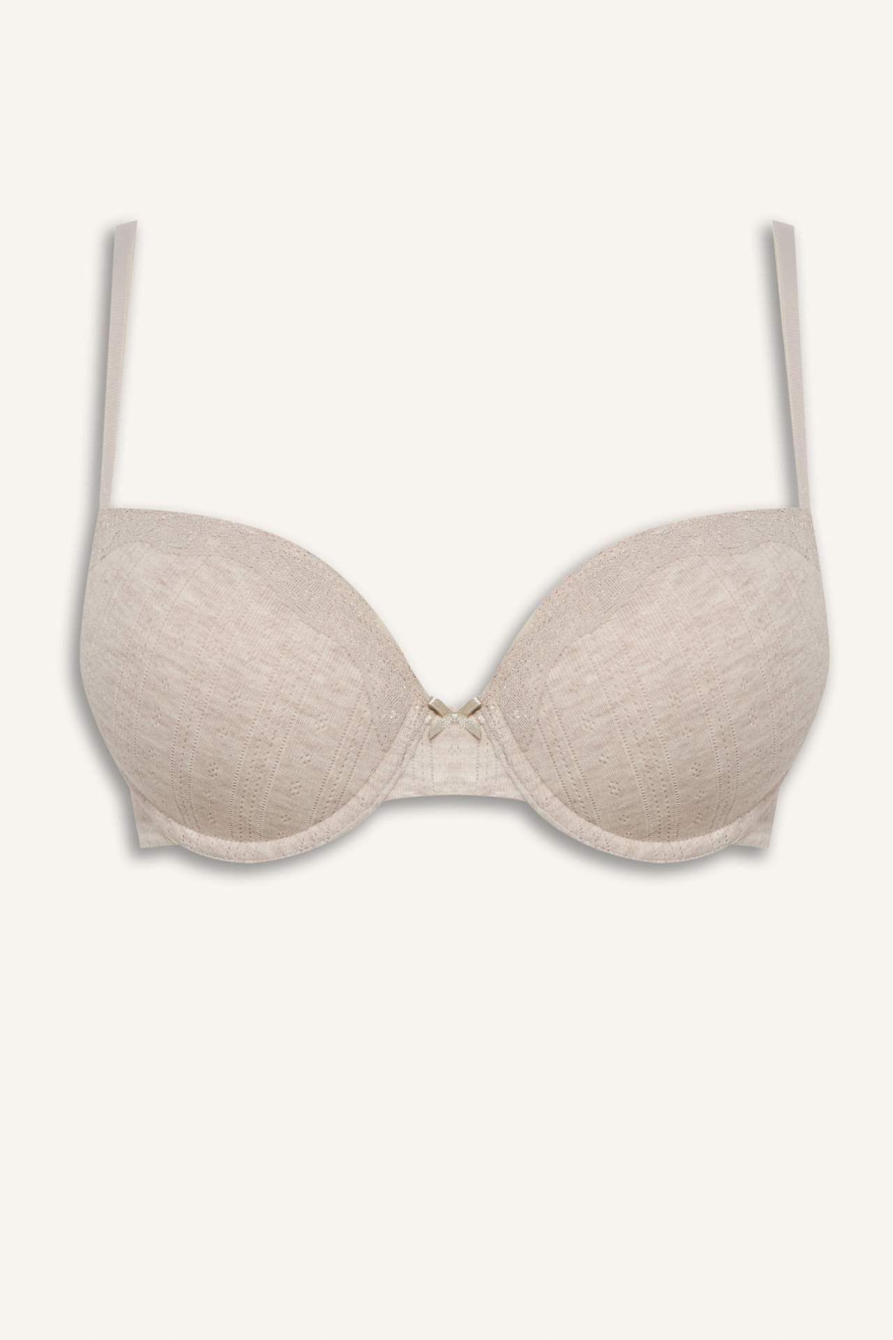 Kaplı, pedsiz ve balenli tasarımıyla tişört bra, göğüslere doğal destek ve şekil verir. Yumuşak ve pürüzsüz dokusu sayesinde tişört ve bluzlar altında iz yapmadan konforlu bir kullanım sunar. Poliester 100%,Pamuk 49%,Poliester 51% Manken Bedeni: Göğüs: 80 Boy: 0 Basen: 89 Bel: 60