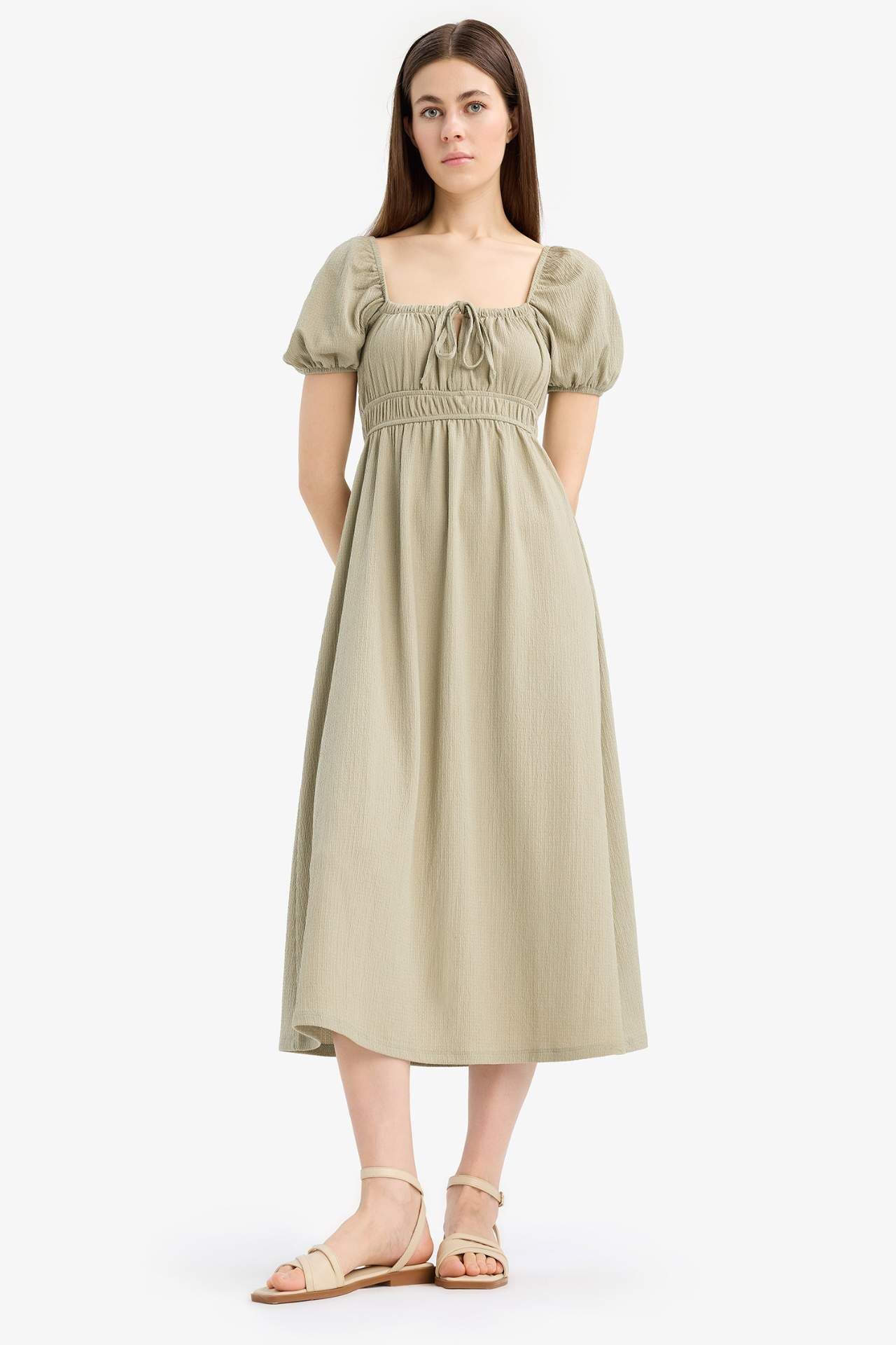 Kare Yaka Bürümcük Kısa Kollu Midi Elbise