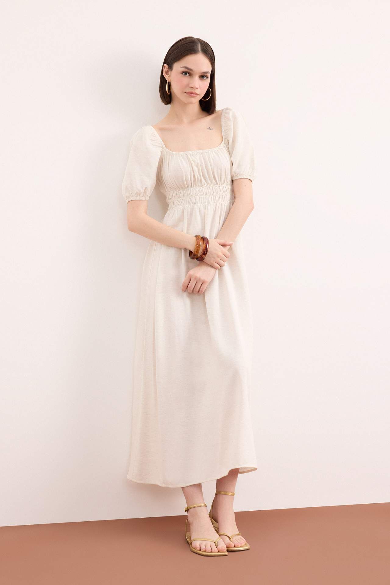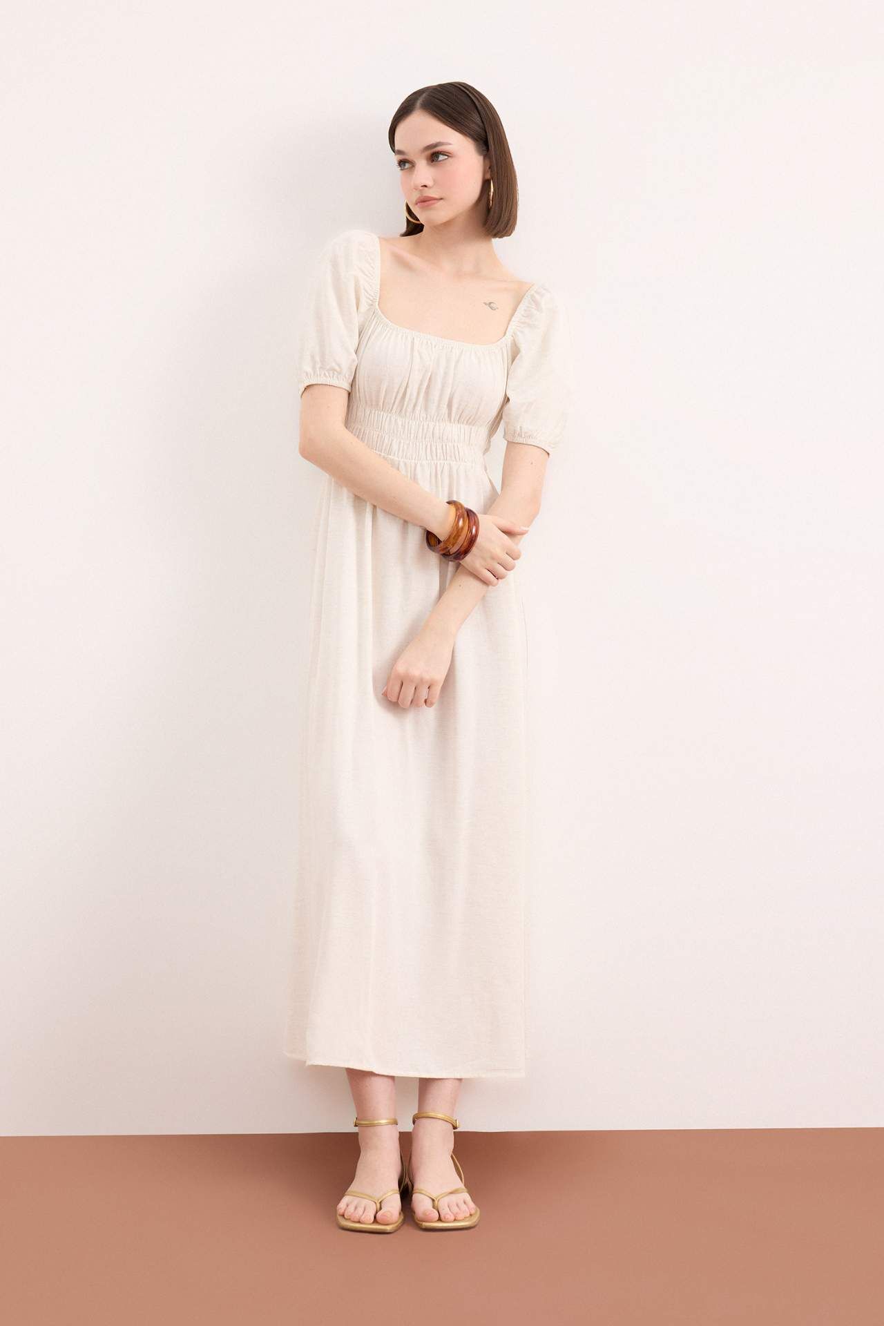 Kare Yaka Keten Karışımlı Kısa Kollu Midi Elbise