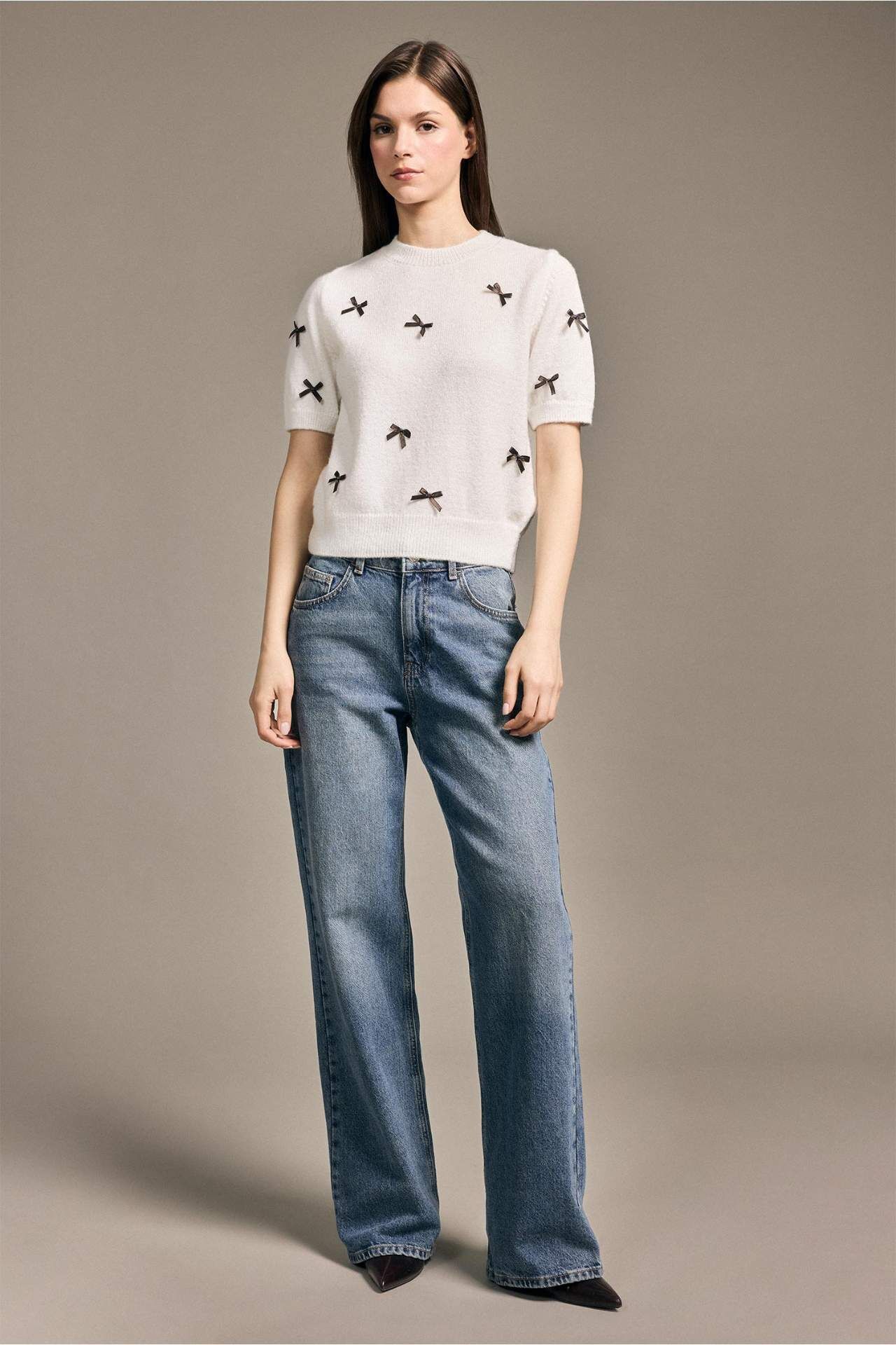 Fiyonklu kısa kollu kazak, zarif fiyonk detayıyla feminen bir şıklık sunar. Yumuşak dokusu ve rahat kesimi, günlük kombinler için idealdir. Akrilik 65%,Poliester 35% Manken Bedeni: Göğüs: 84 Boy: 1,74 Basen: 90 Bel: 60