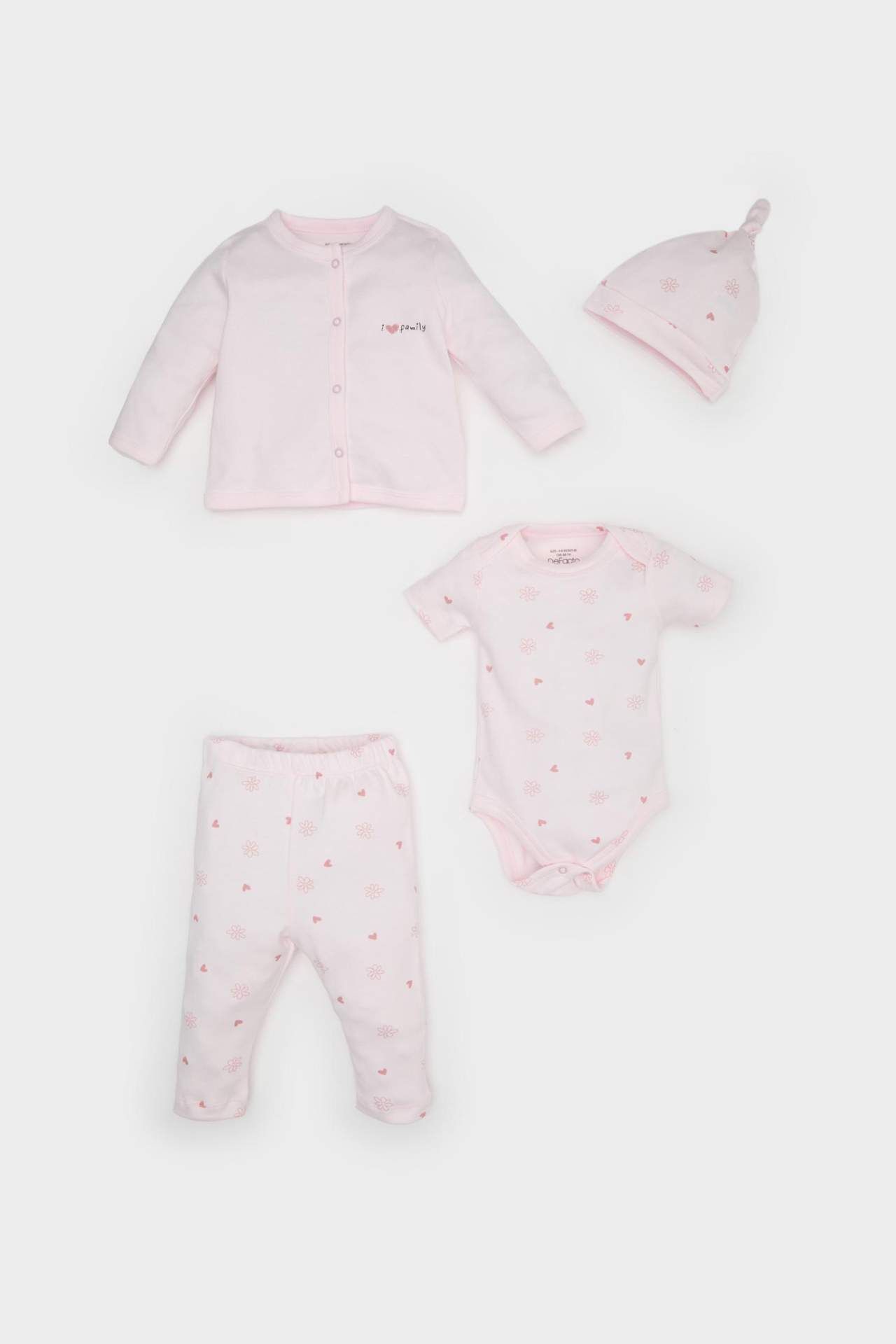 DeFacto Kız Bebek 4'lü Takım Desenli Uzun Kollu Tişört Çıtçıtlı Kısa Kollu Body Beli Lastikli Alt Bere