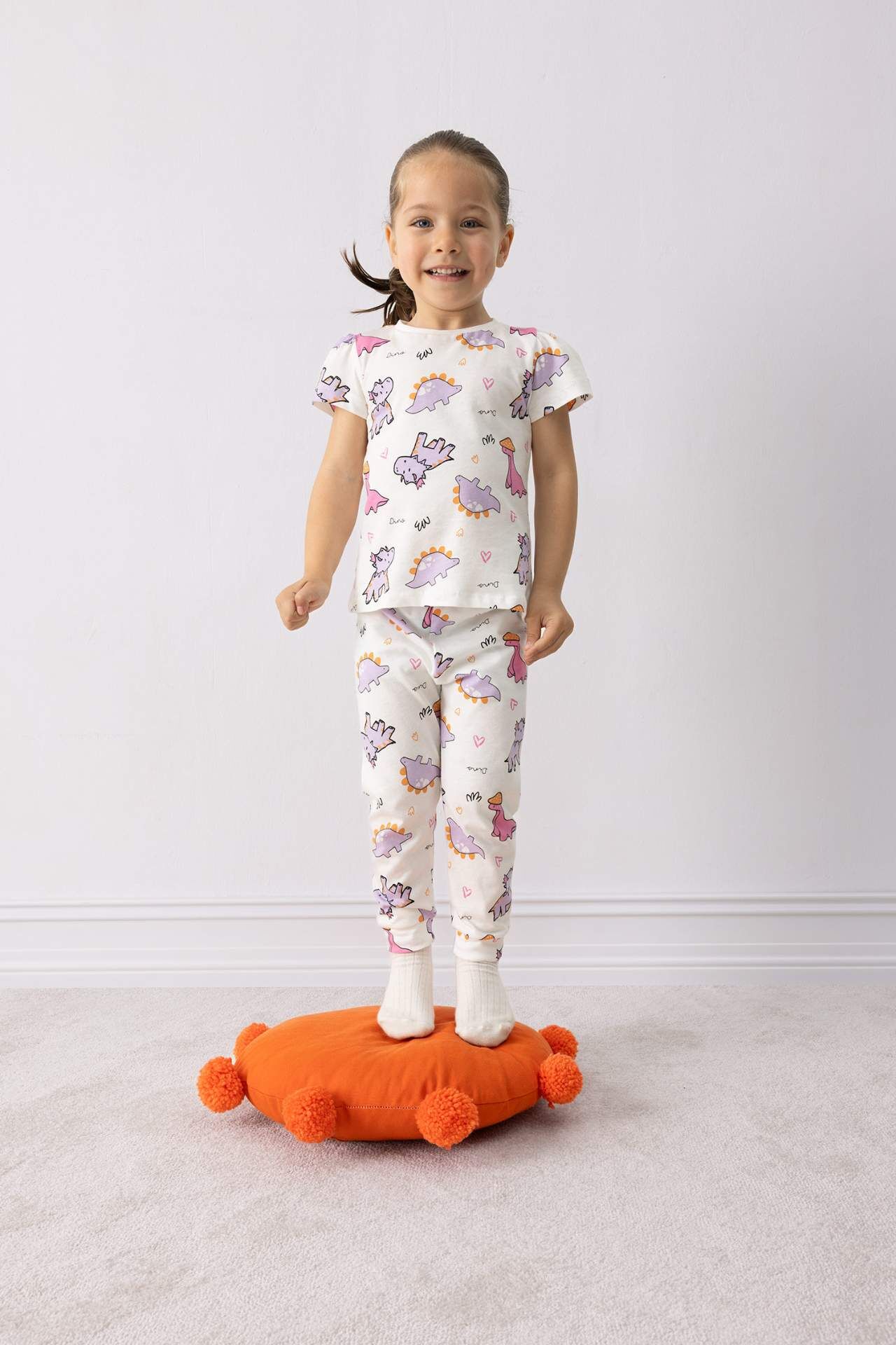 DeFacto Kız Bebek Pijama Takımı Dinazor Baskılı Kısa Kollu Penye Pijama Üstü Esnek Belli Uzun Pijama Altı