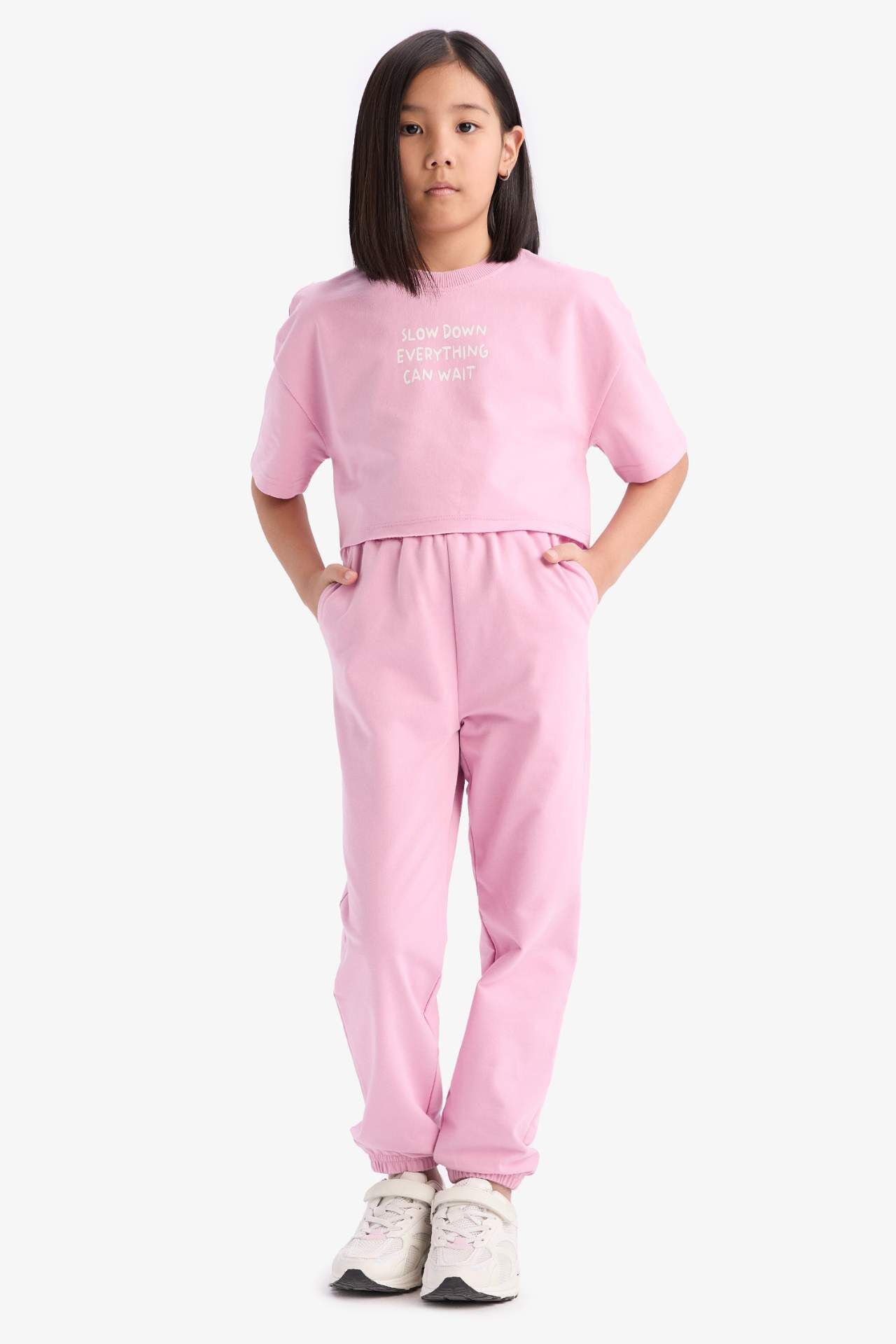 Kız Çocuk 2'li Takım Bisiklet Yaka Baskılı Kısa Kollu Tişört Beli Paçası Lastikli Eşofman Altı