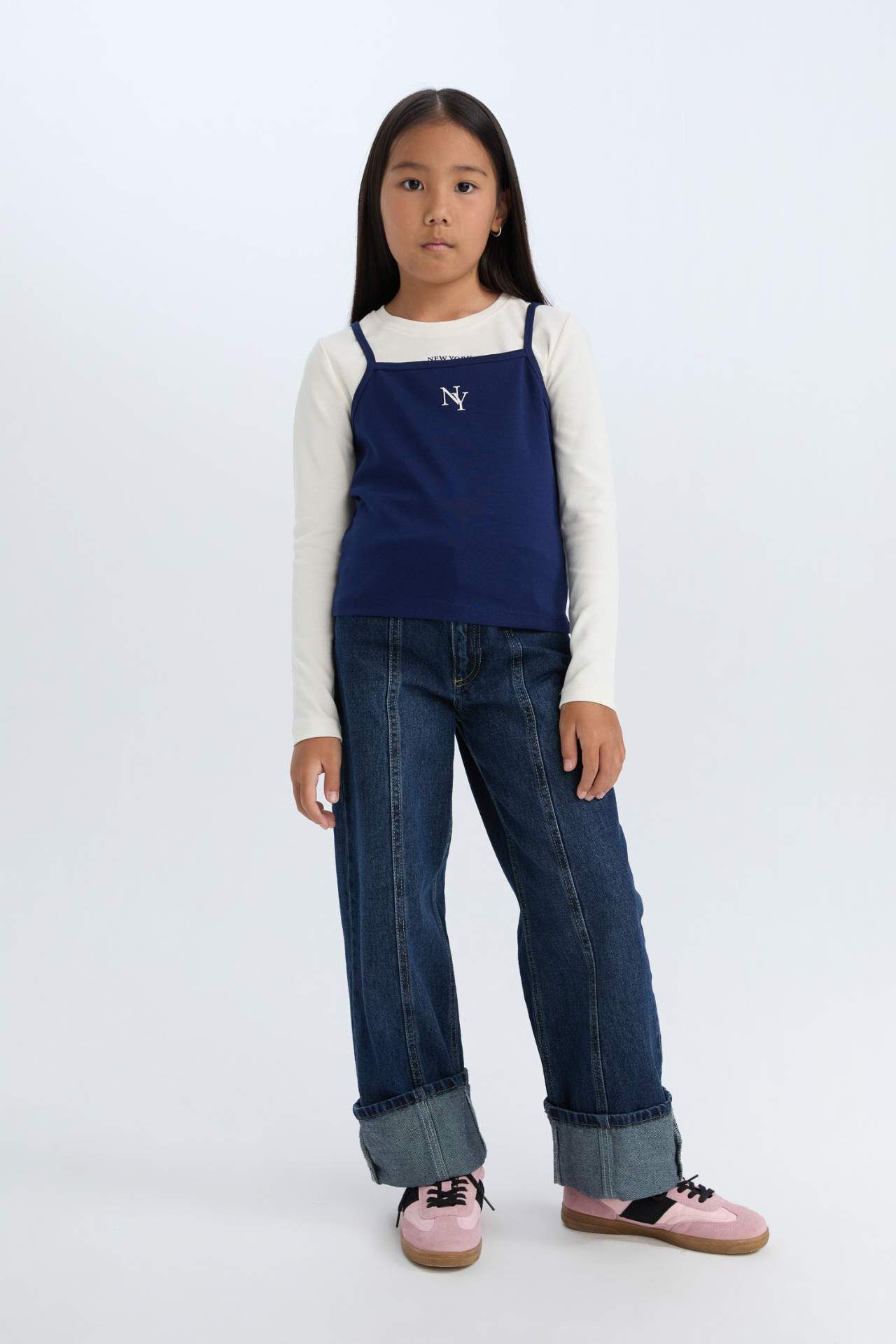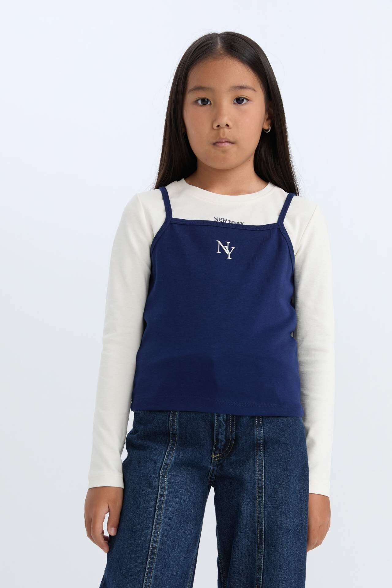 DeFacto Kız Çocuk 2'li Üst Takım Askılı Üst Crop Bisiklet Yaka Baskılı Ribana Uzun Kollu Tişört