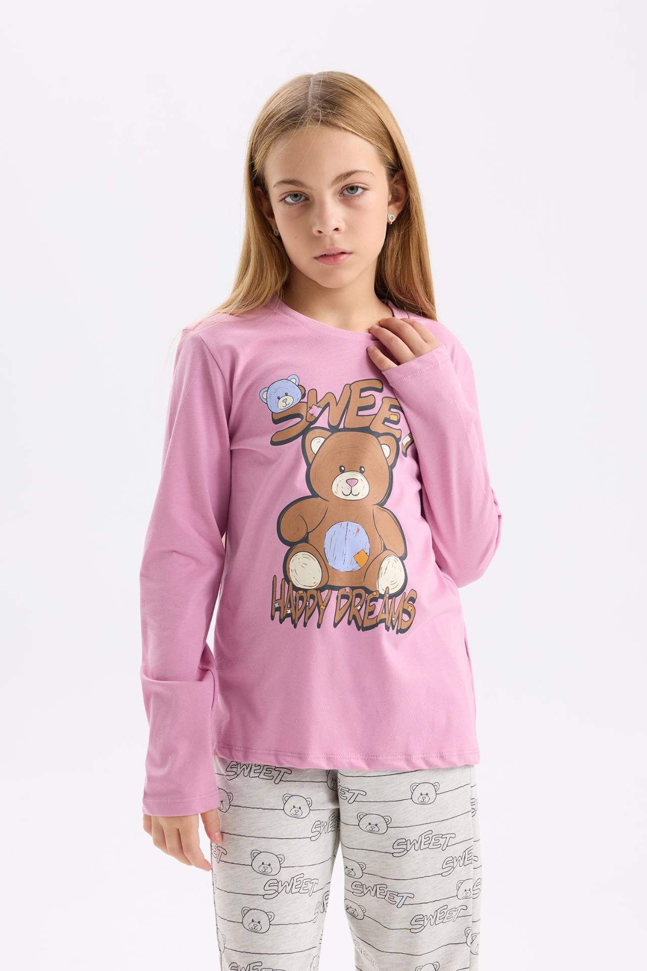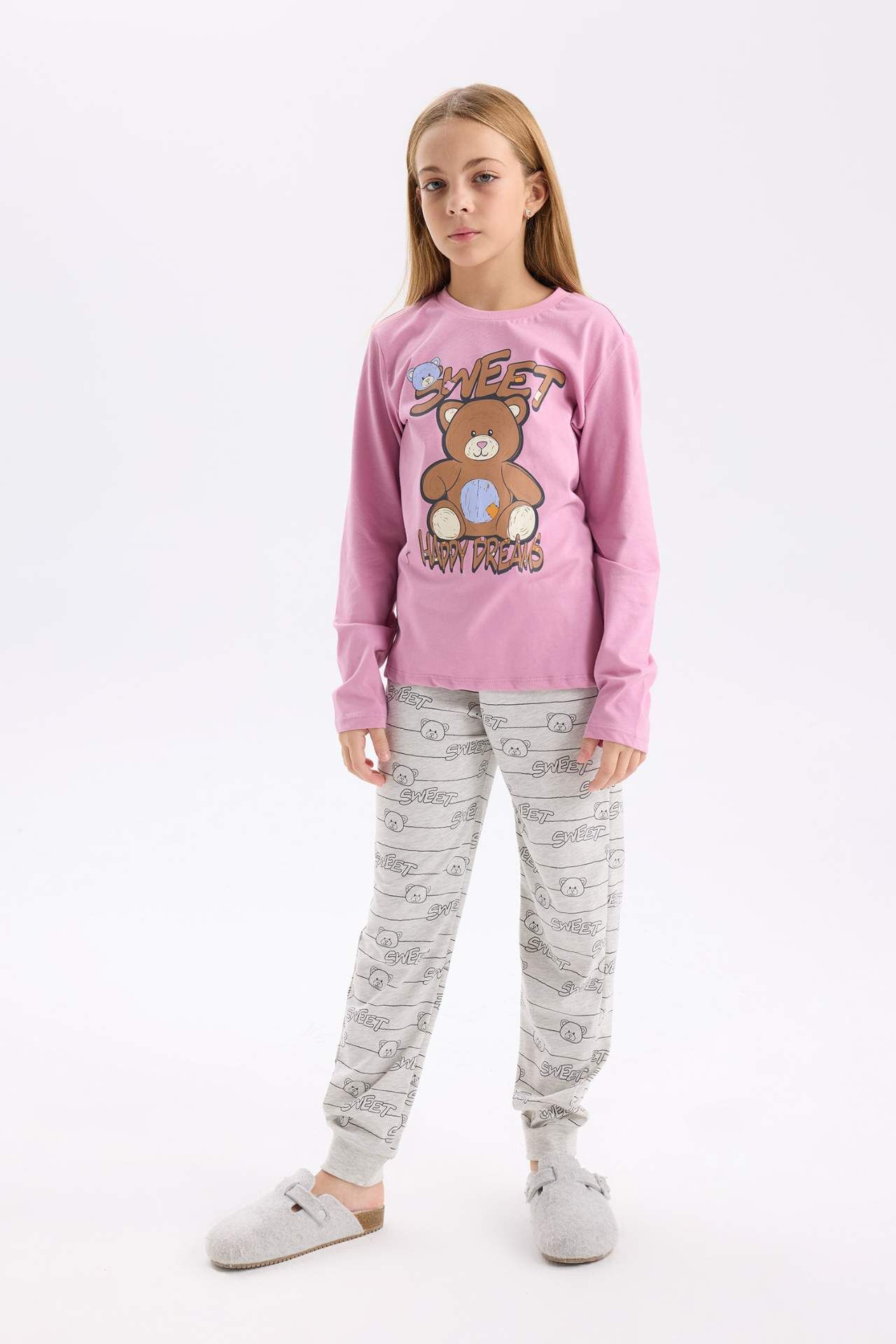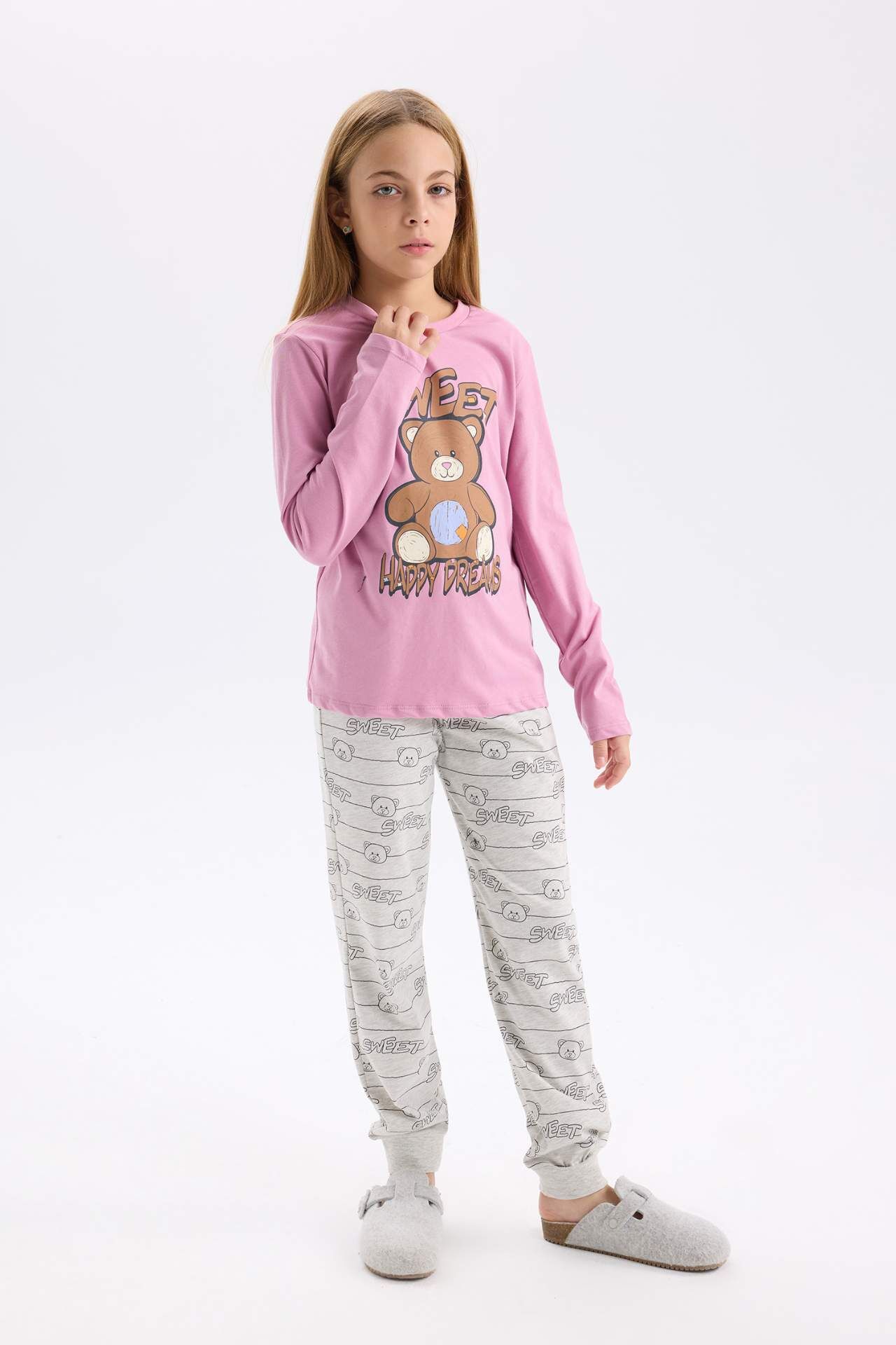 DeFacto Kız Çocuk Ayıcık Baskılı Uzun Kollu Üst Beli Lastikli Desenli Uzun Alt Pijama Takımı