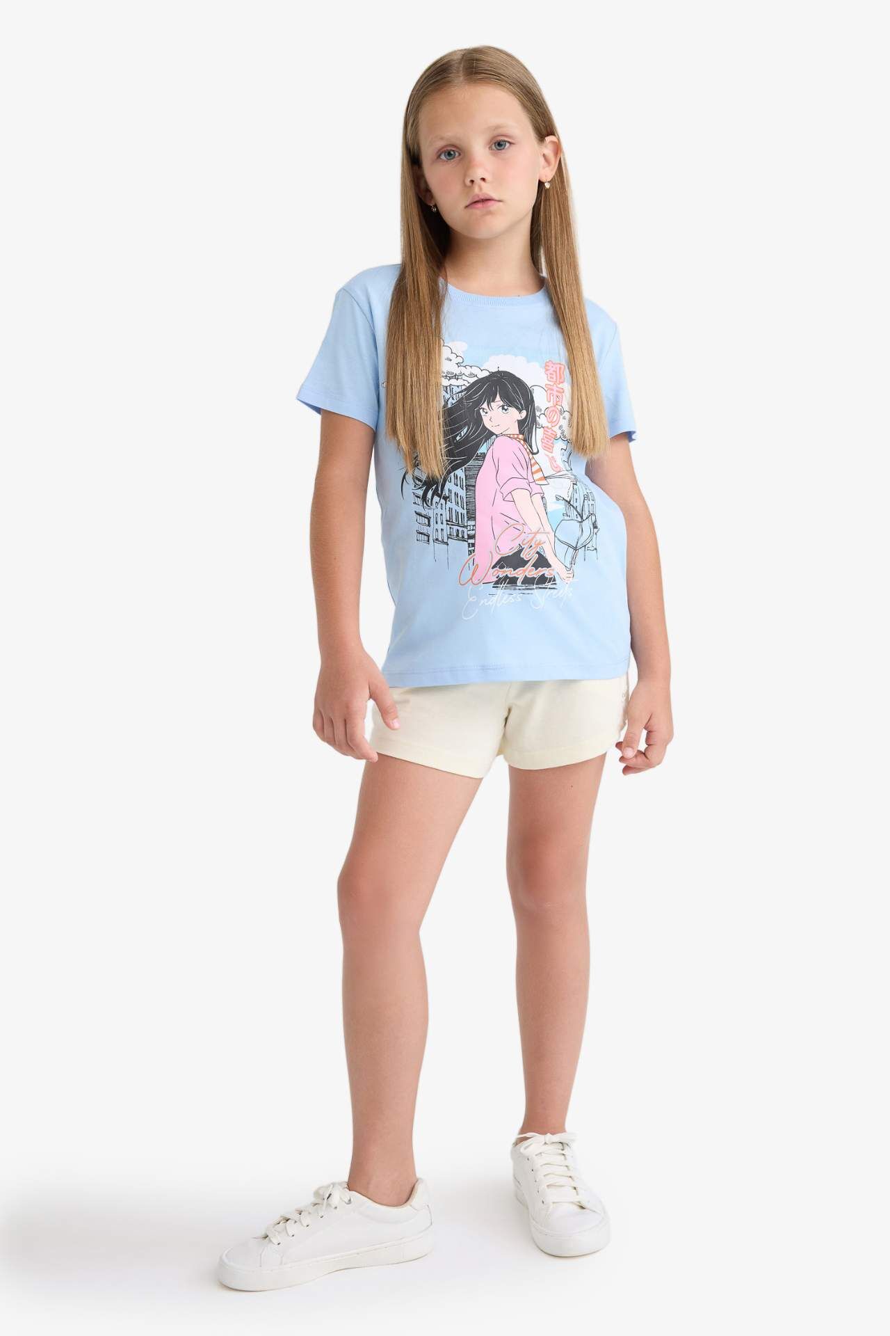 DeFacto Kız Çocuk Bisiklet Yaka Anime Baskılı Kısa Kollu Tişört E0351A825SMBE745