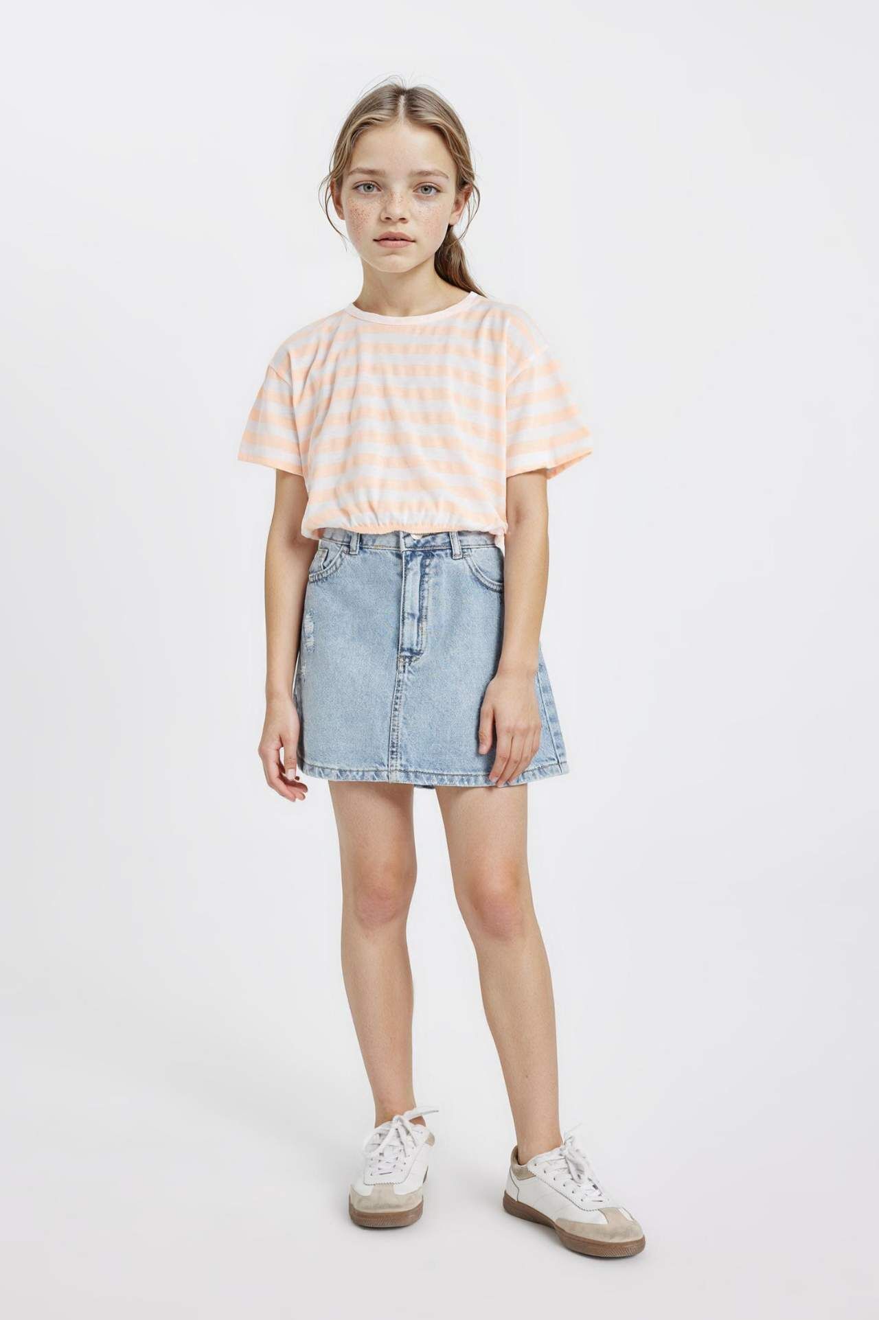 Kız çocuklar için şık ve rahat bir seçenek olan Bisiklet Yaka Çizgili Kısa Kollu Tişört, günlük kullanım için idealdir. Kaliteli kumaşı ve şık tasarımıyla dikkat çeker. Yaz aylarında kombinlerin vazgeçilmezi olmaya aday! Pamuk 47%,Poliester 53%,Pamuk 47%,Poliester 53%