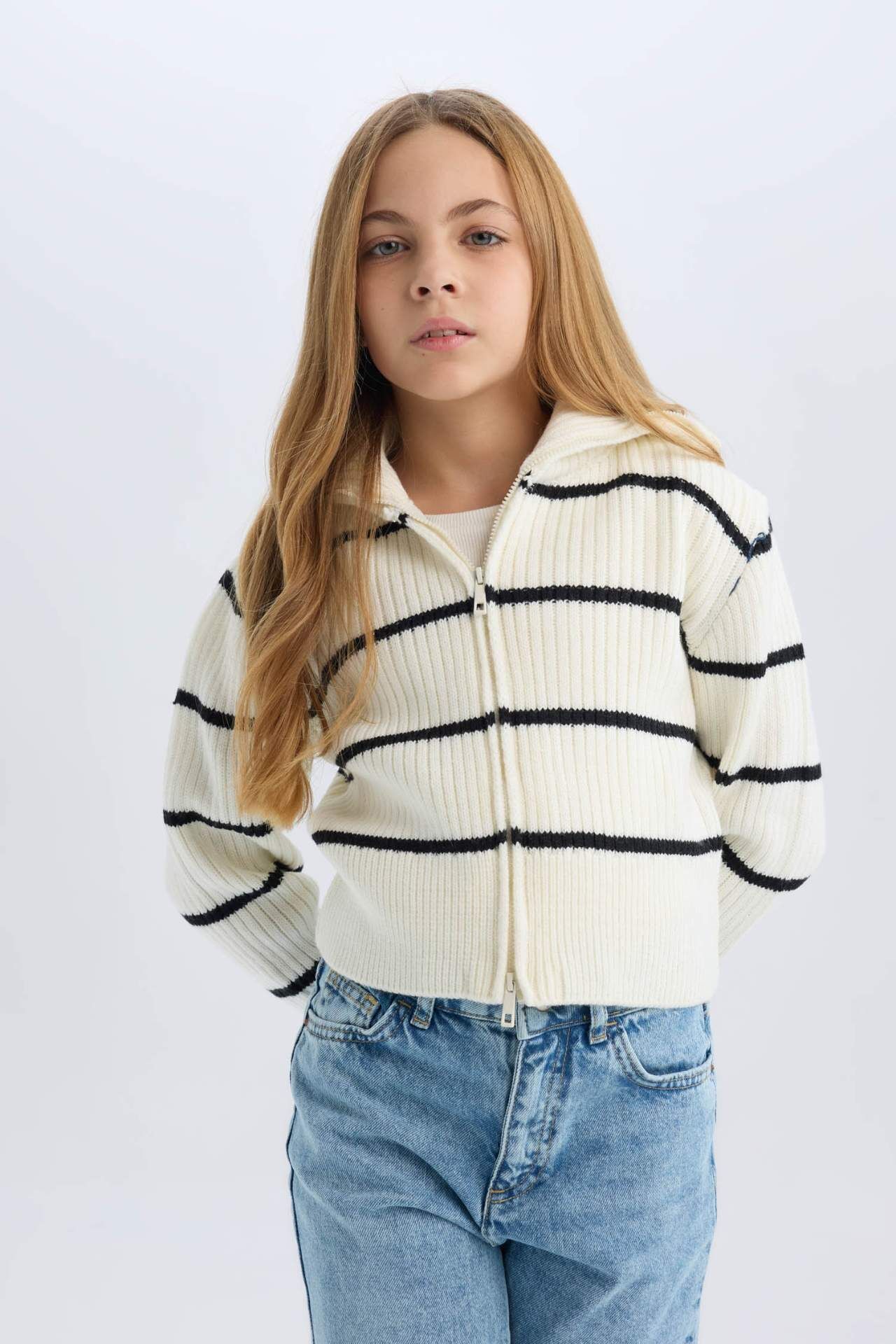 DeFacto Kız Çocuk Çizgili Fermuarlı Triko Hırka