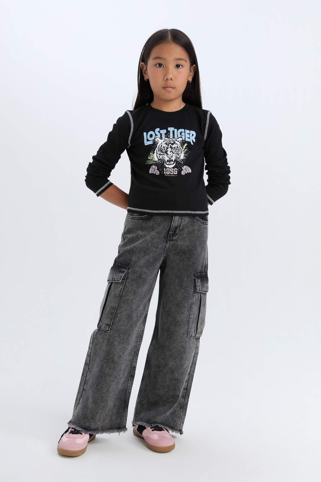 DeFacto Kız Çocuk Crop Bisiklet Yaka Baskılı Fitilli Kaşkorse Uzun Kollu Tişört D3430A824WNBK81