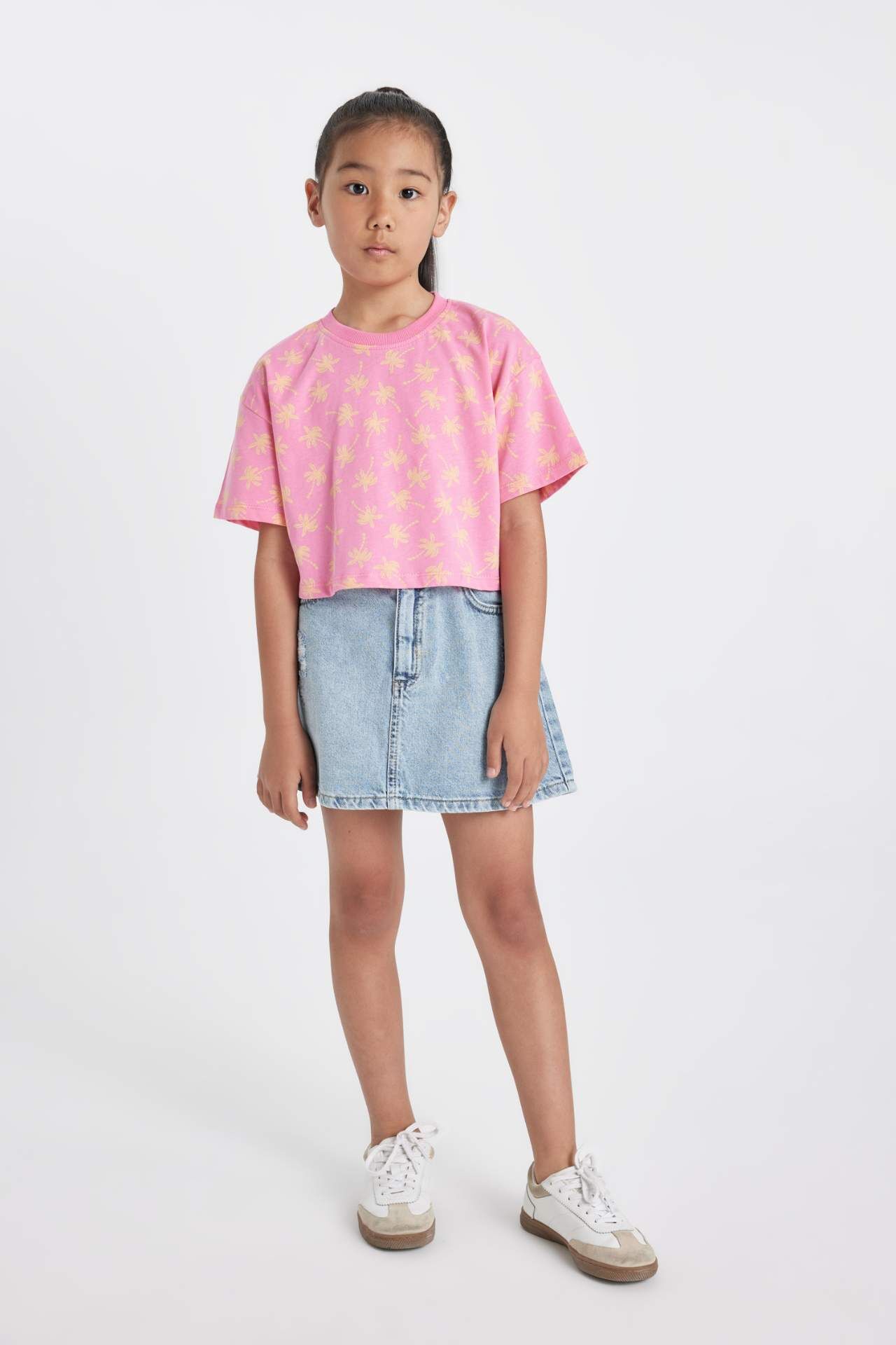 DeFactoFit Kız Çocuk Crop Bisiklet Yaka Desenli Kısa Kollu Tişört D1288A824HSPN46