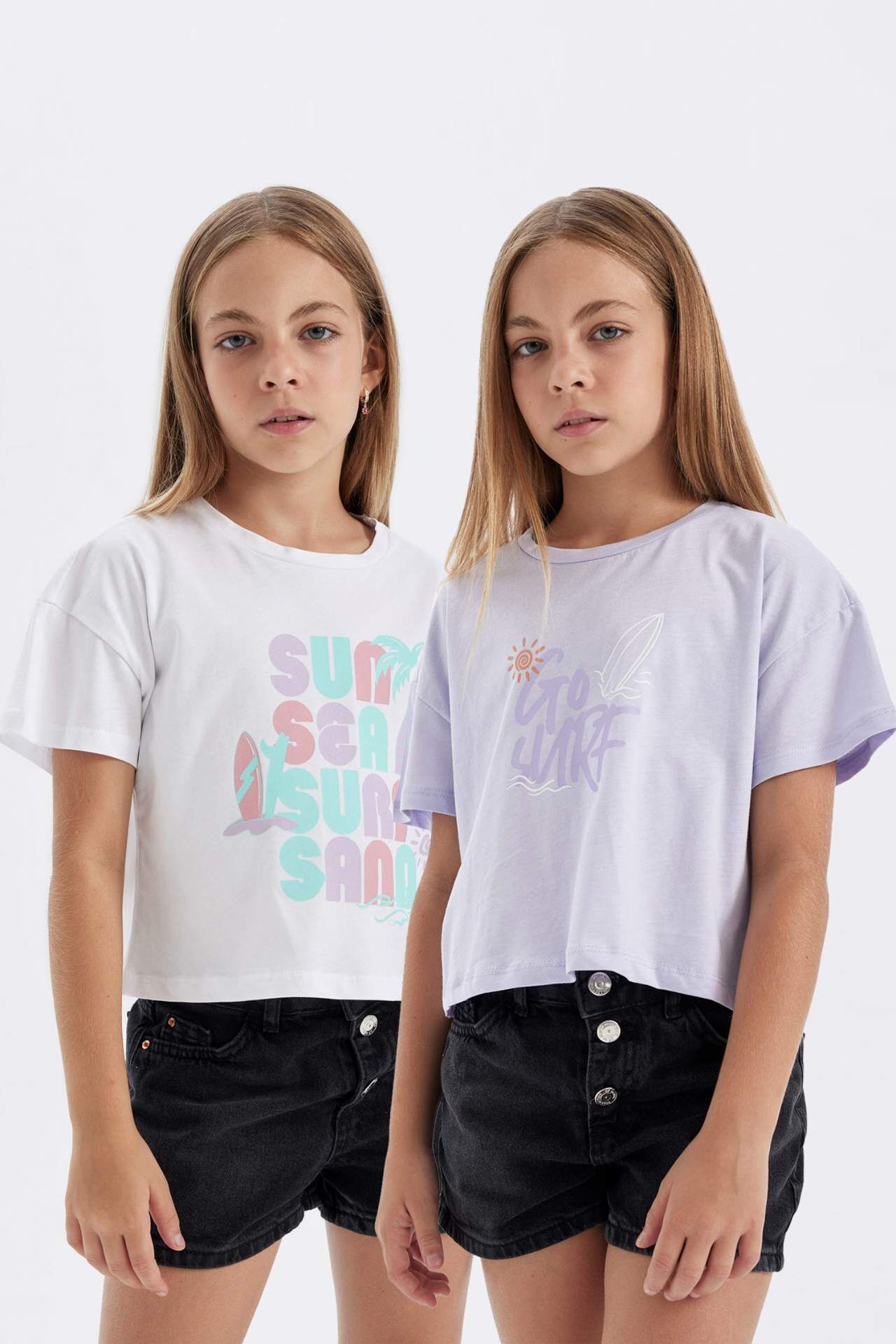 DeFactoFit Kız Çocuk Crop Top Bisiklet Yaka Baskılı 2'li Kısa Kollu Tişört