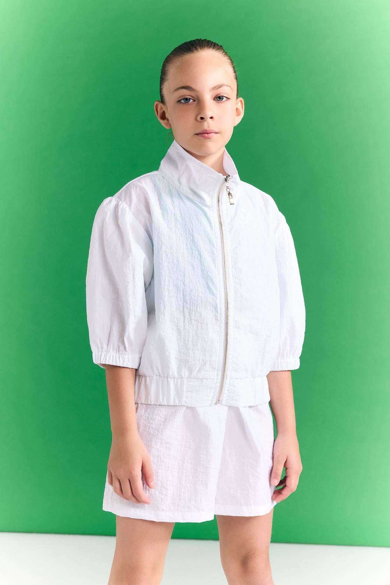 DeFactoFit Kız Çocuk Dik Yaka Baskılı Fermuarlı Yarım Kollu Spor Hırka
