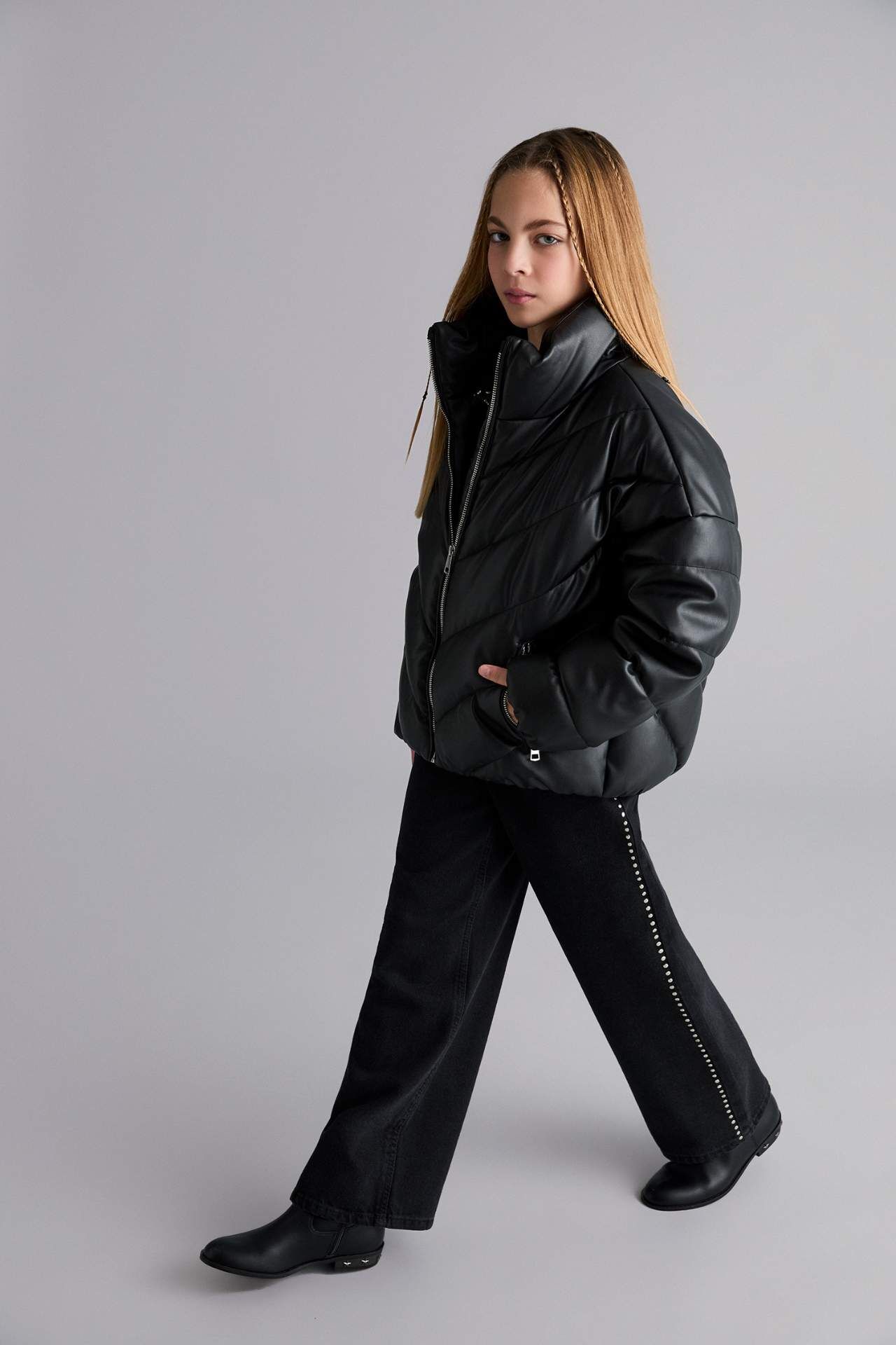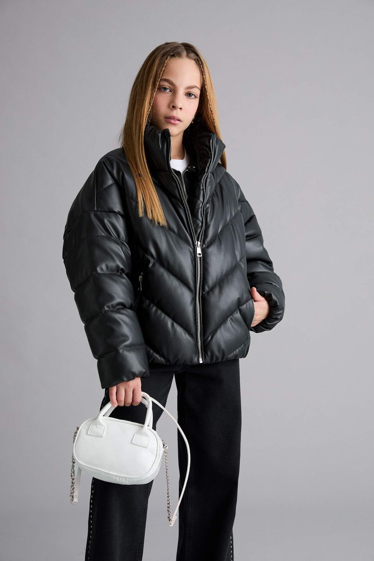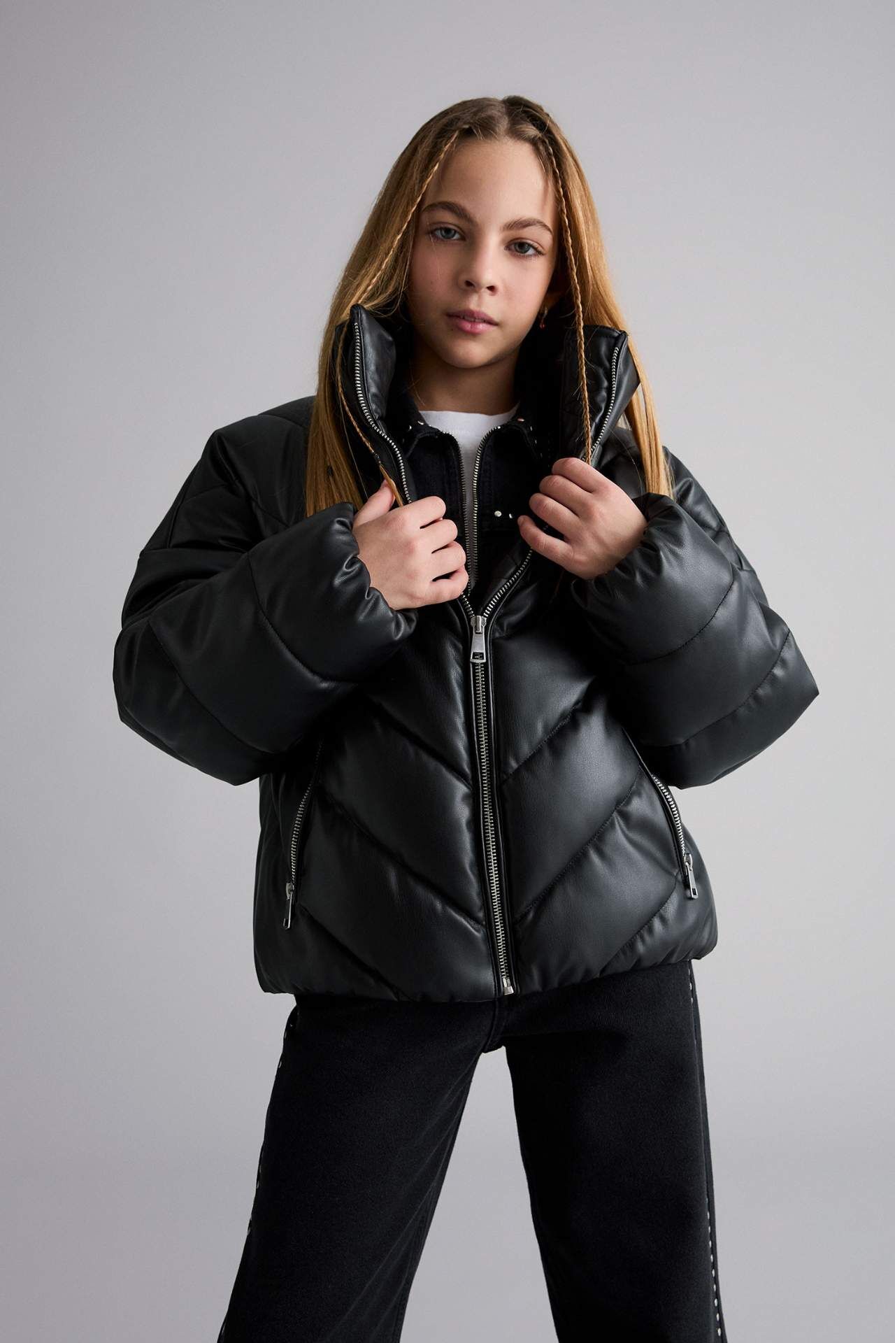 Kız Çocuk Dik Yaka Fermuarlı Şişme Mont