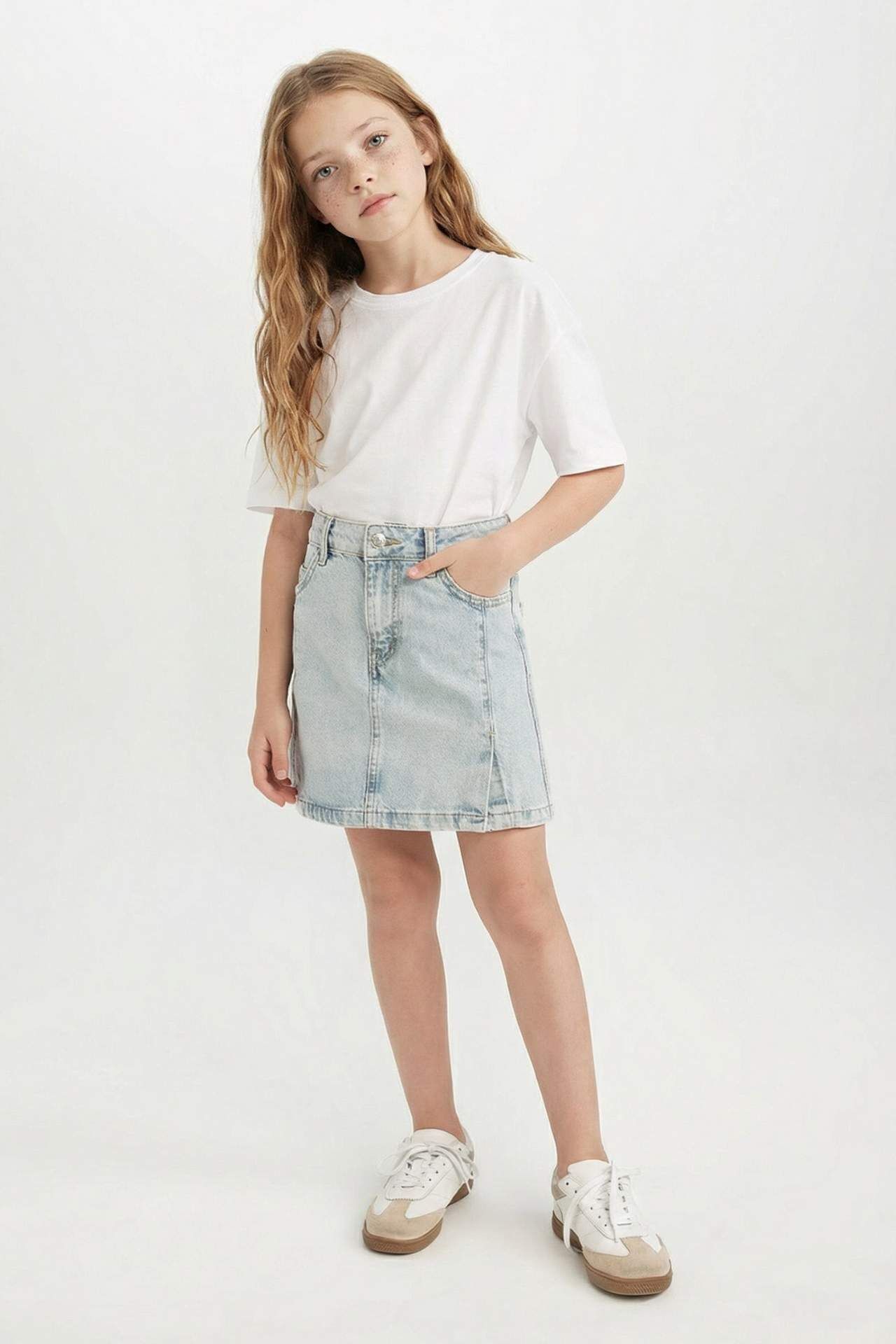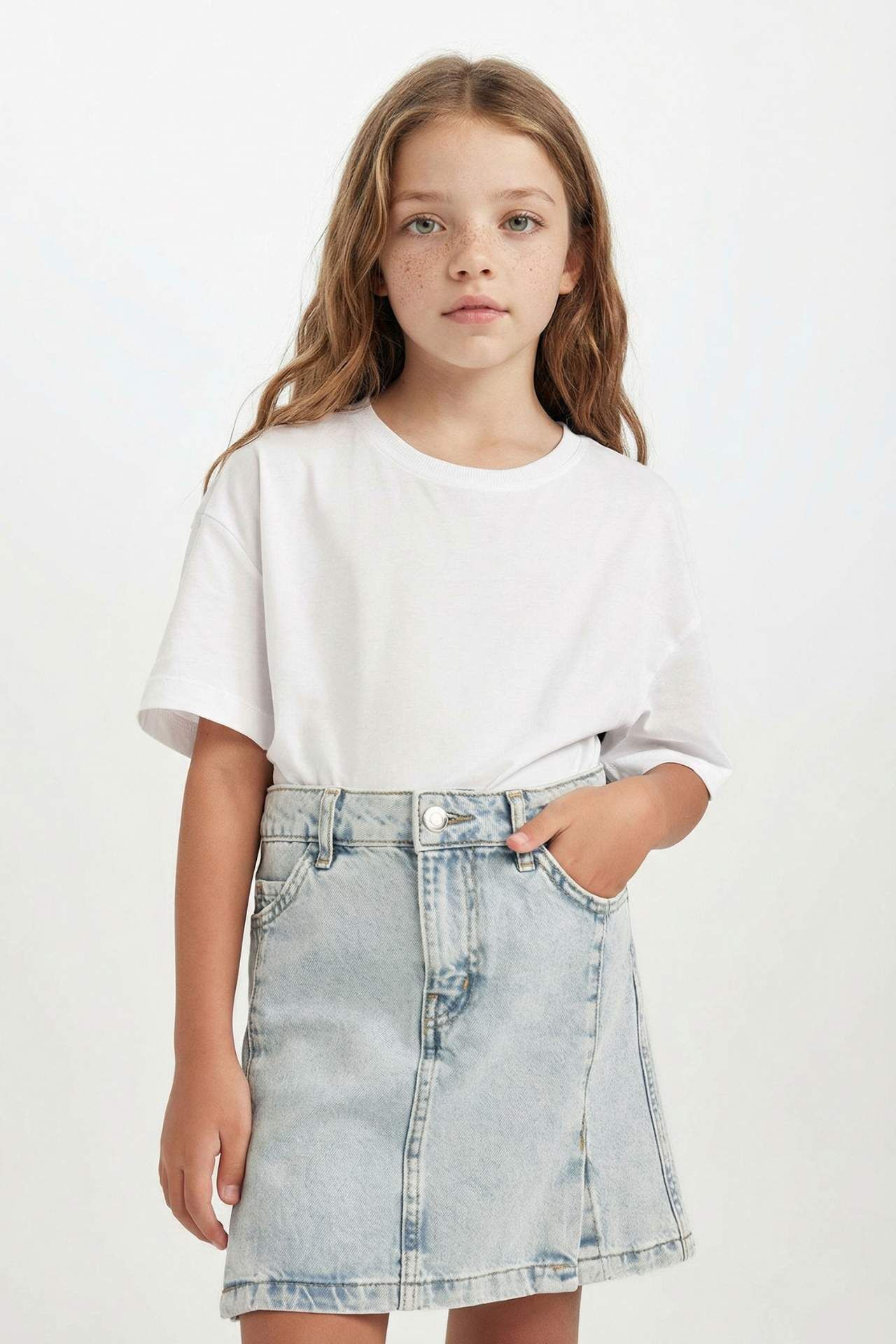 Kız Çocuk Jean Etek, dayanıklı kumaşı ve klasik jean tasarımıyla günlük kullanıma uygundur. Rahat kesimi hareket özgürlüğü sağlarken, şık detaylarıyla farklı üstlerle kolayca kombinlenir. Minikler için hem konforlu hem de tarz bir parçadır. Pamuk 100%