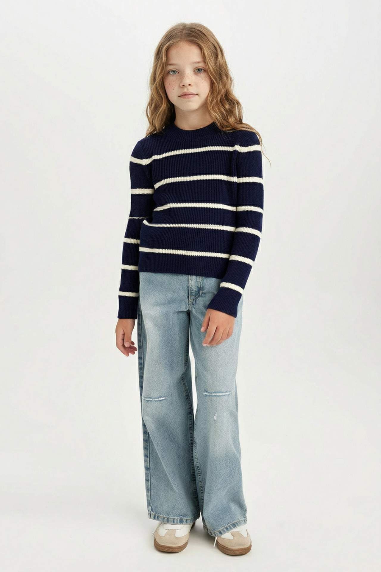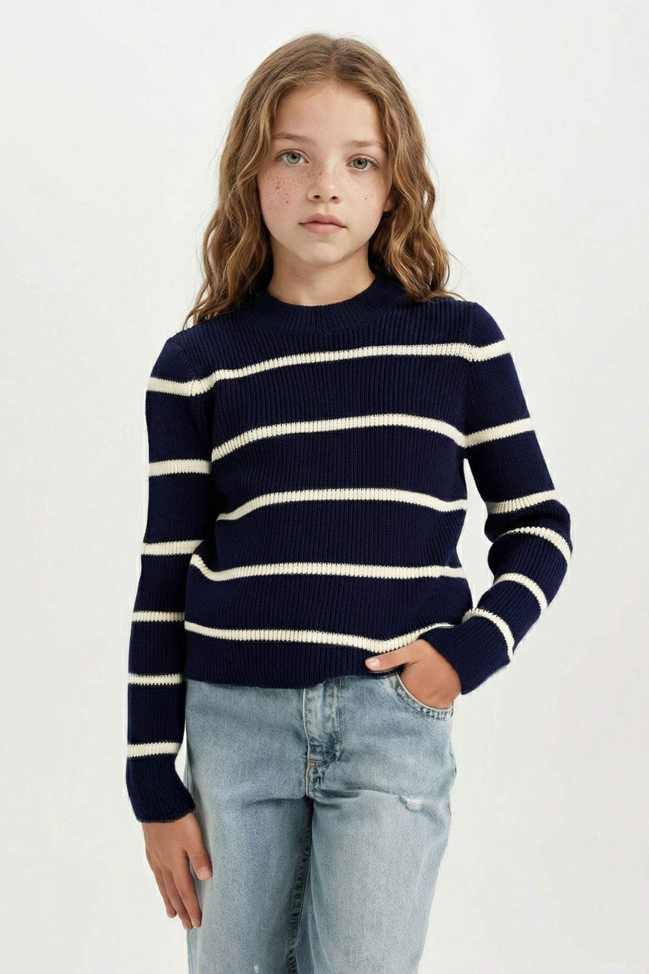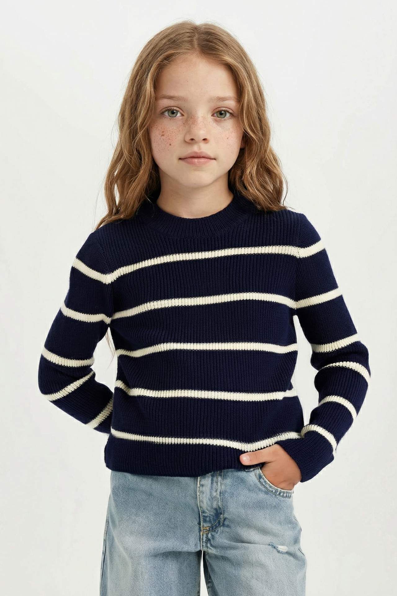 DeFacto Kız Çocuk Fitted Bisiklet Yaka Çizgili Kazak