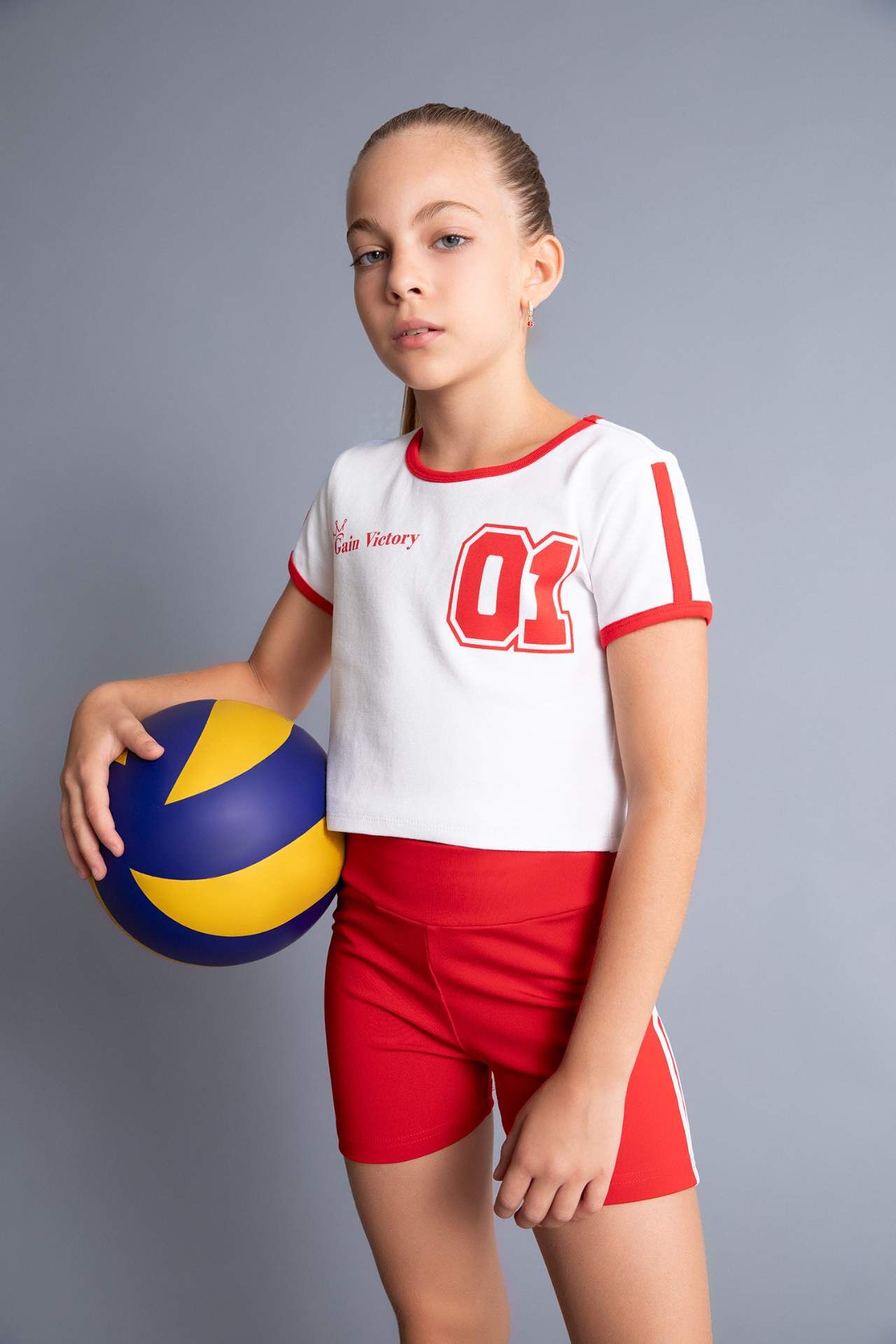 DeFactoFit Kız Çocuk Full Crop Bisiklet Yaka Slogan Baskılı Ribana Kısa Kollu Tişört D1624A824HSWT34