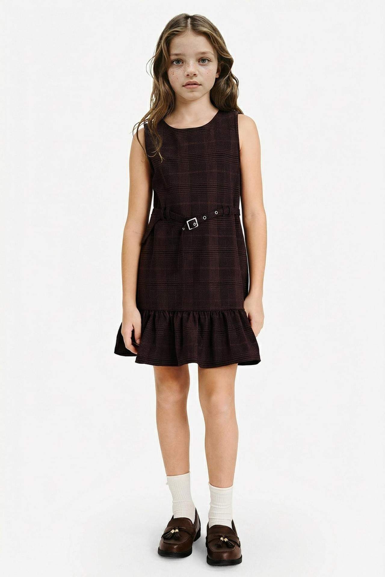 Kız Çocuk Kareli Kemerli Kolsuz Elbise