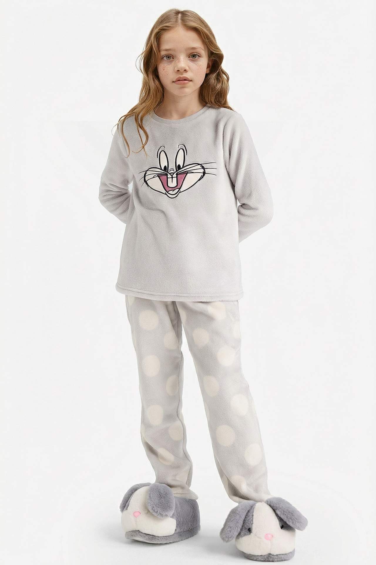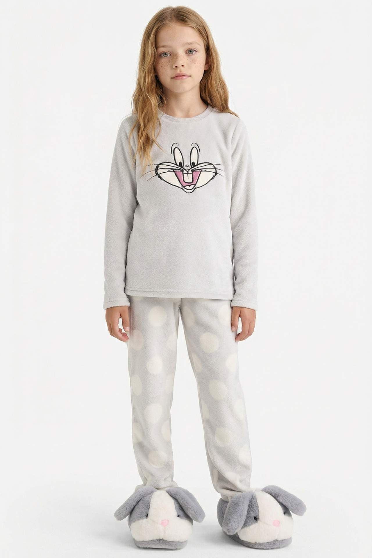 Kız Çocuk Looney Tunes Pijama Takımı Nakışlı Pelüş Uzun Kollu Üst Uzun Alt