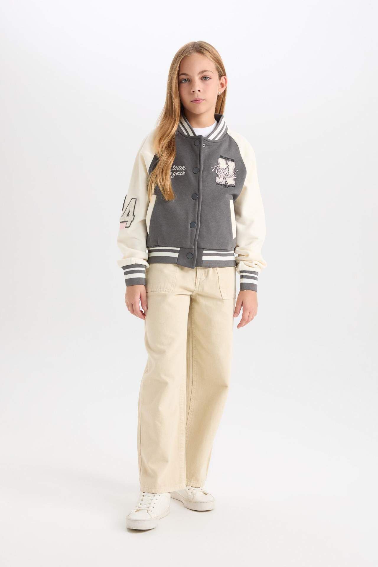 DeFacto Kız Çocuk Nakışlı Kolej Yaka Çıtçıt Kapamalı Kalın Kumaş İçi Yumuşak Tüylü Bomber Hırka
