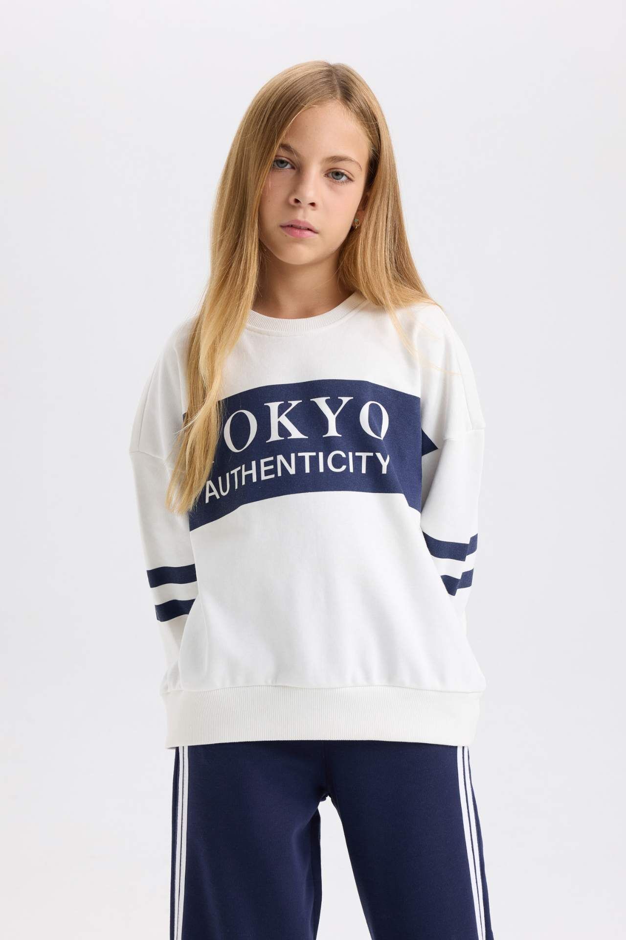DeFacto Kız Çocuk Oversize Fit Geniş Kalıp Bisiklet Yaka Çizgili Sweatshirt