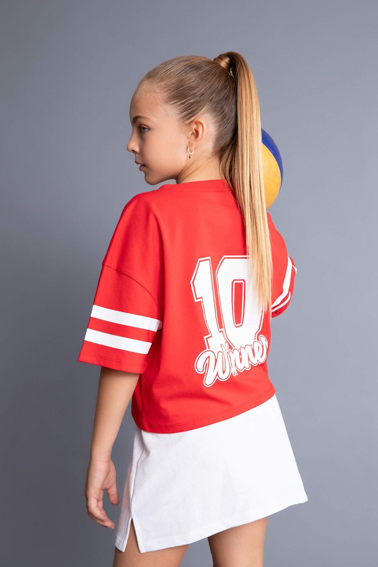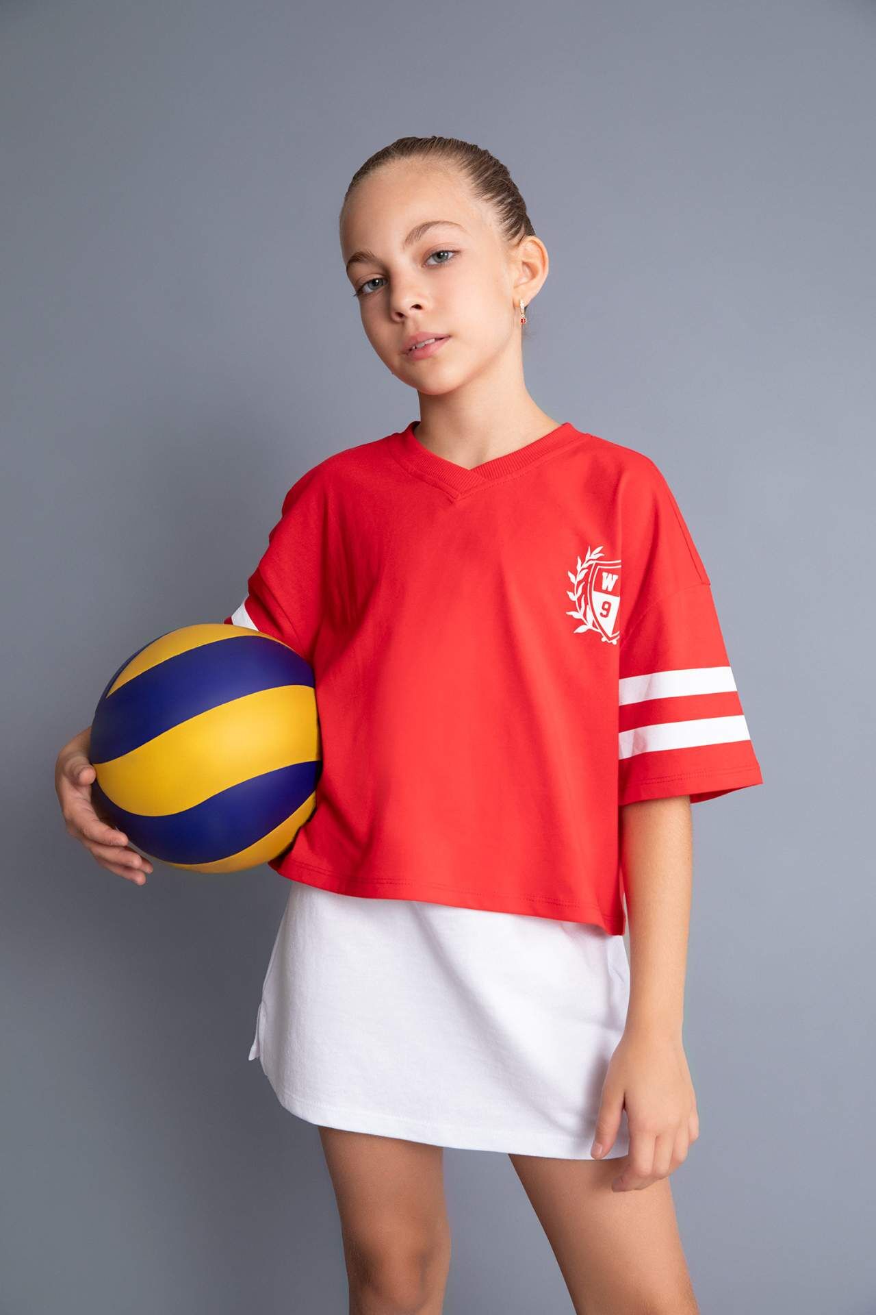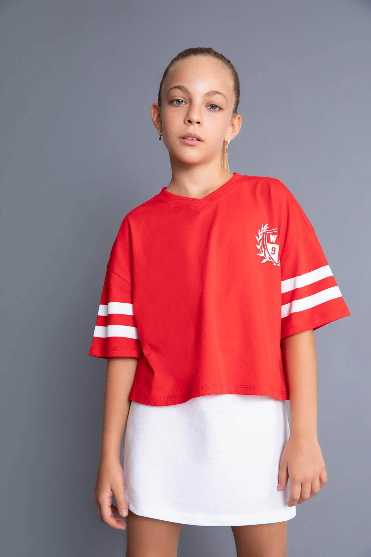 DeFacto DeFactoFit Kız Çocuk Oversize Fit V Yaka Slogan Baskılı Kısa Kollu Tişört