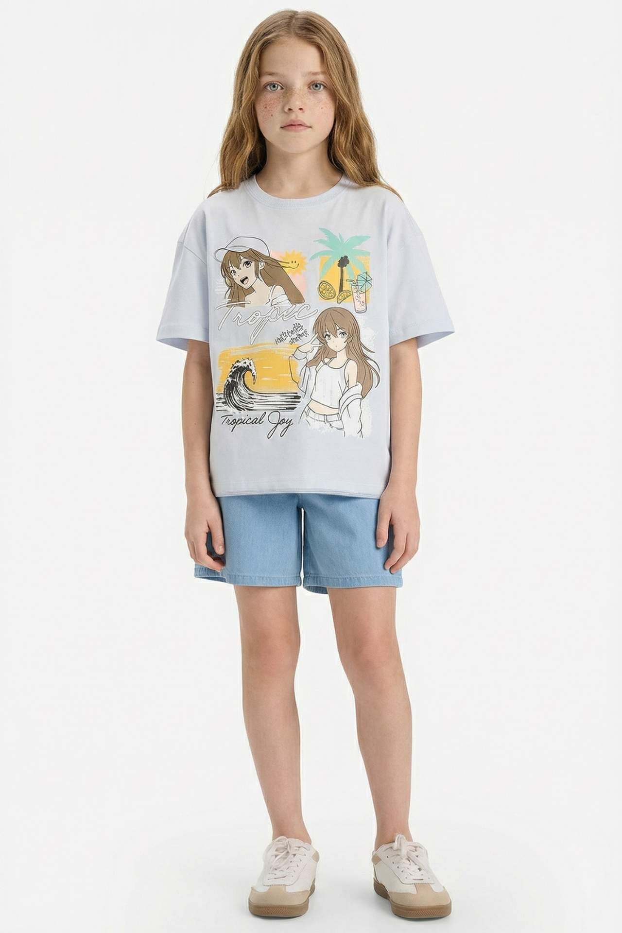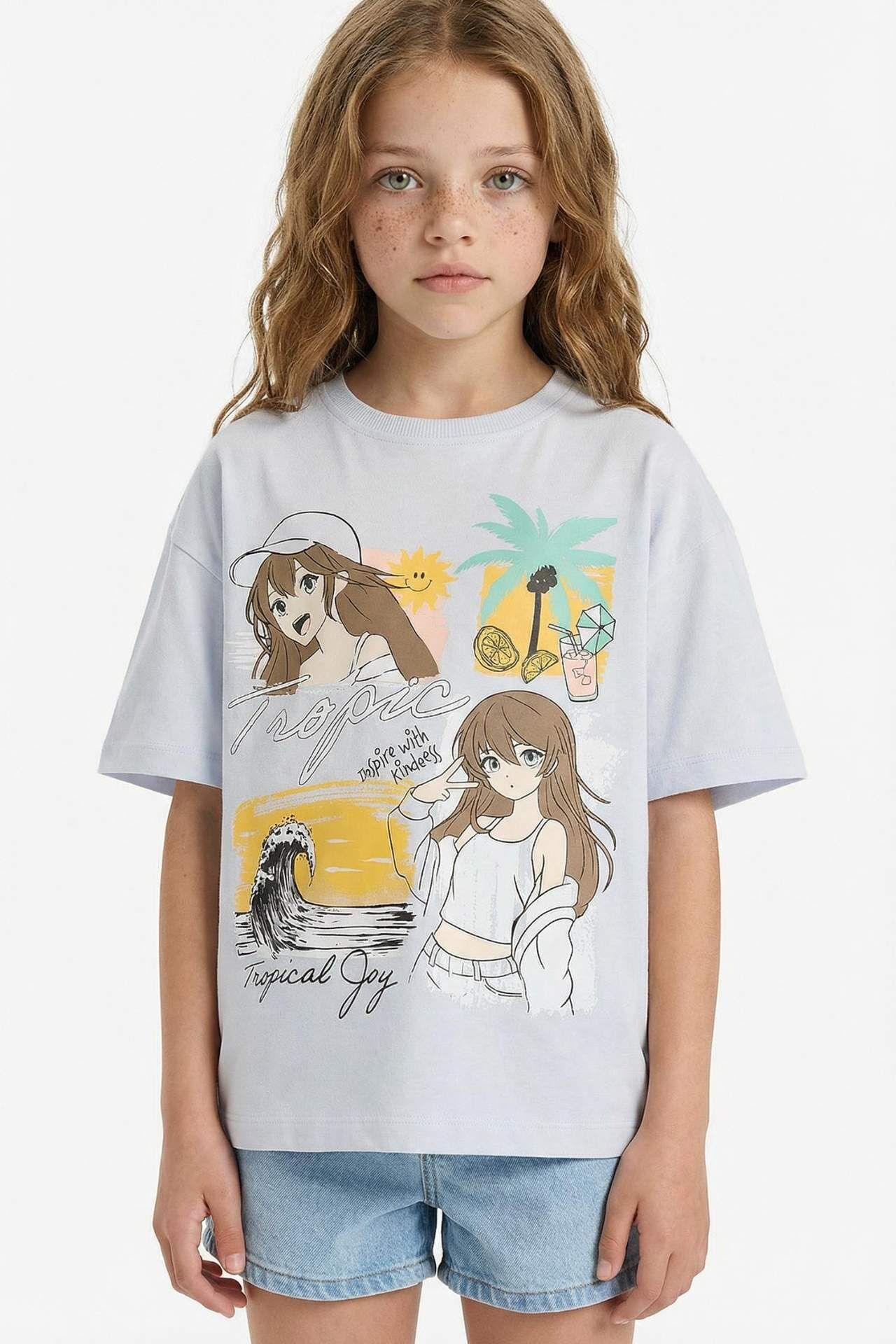 DeFacto Kız Çocuk Oversize Geniş Kalıp Bisiklet Yaka Baskılı Kısa Kollu Tişört E0356A825SMBE823