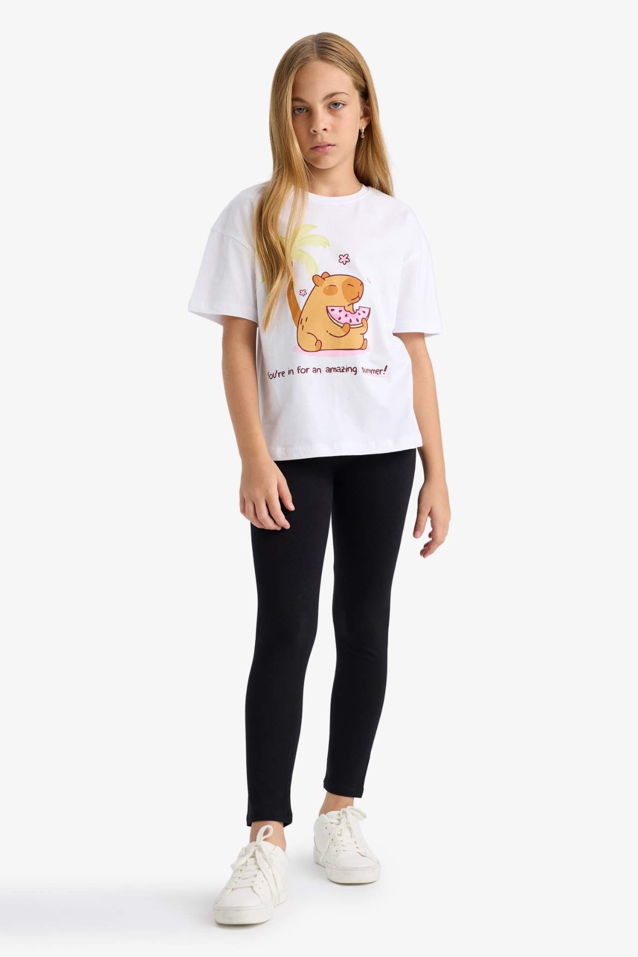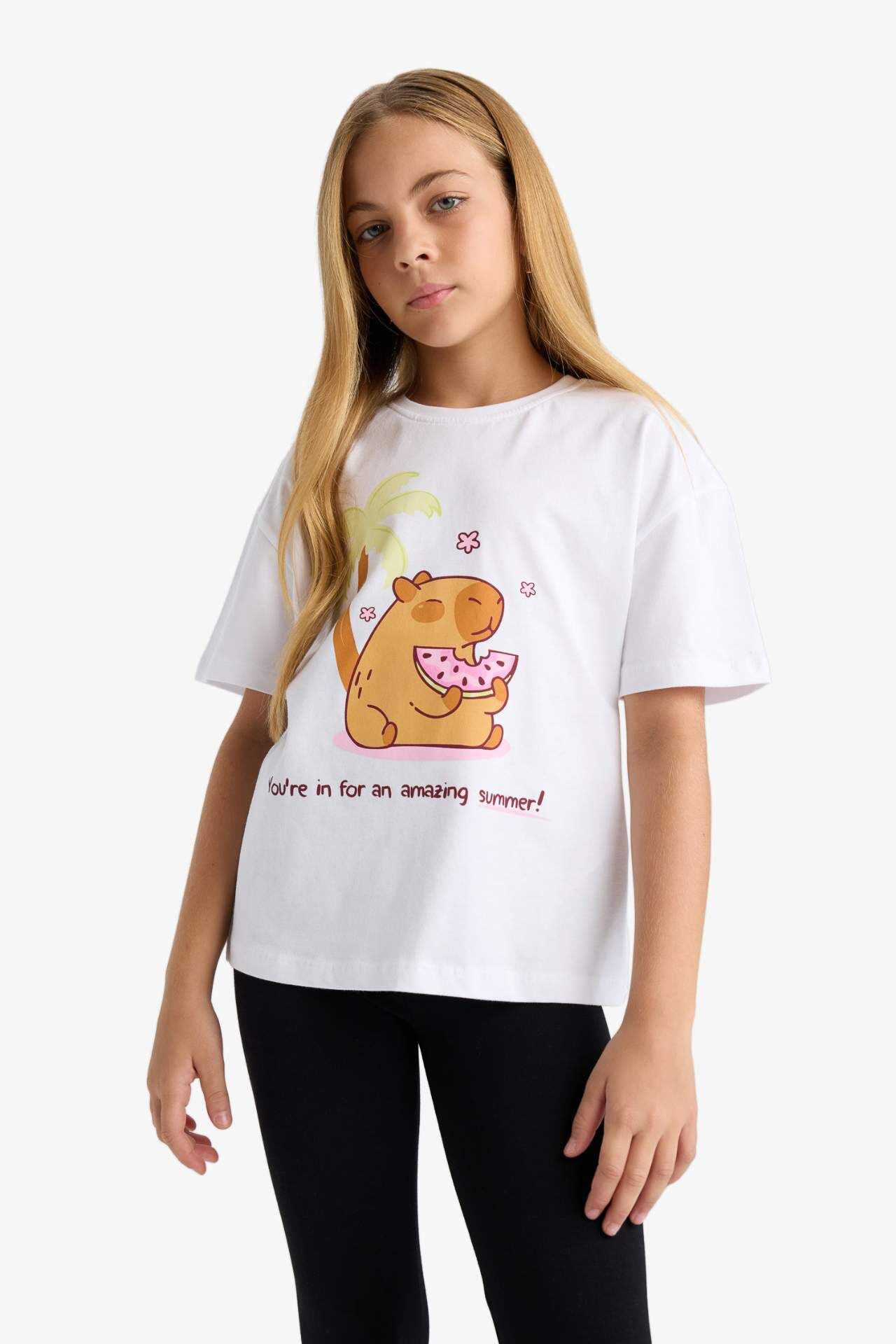 DeFacto Kız Çocuk Oversize Geniş Kalıp Bisiklet Yaka Baskılı Kısa Kollu Tişört F9722A825HSWT34