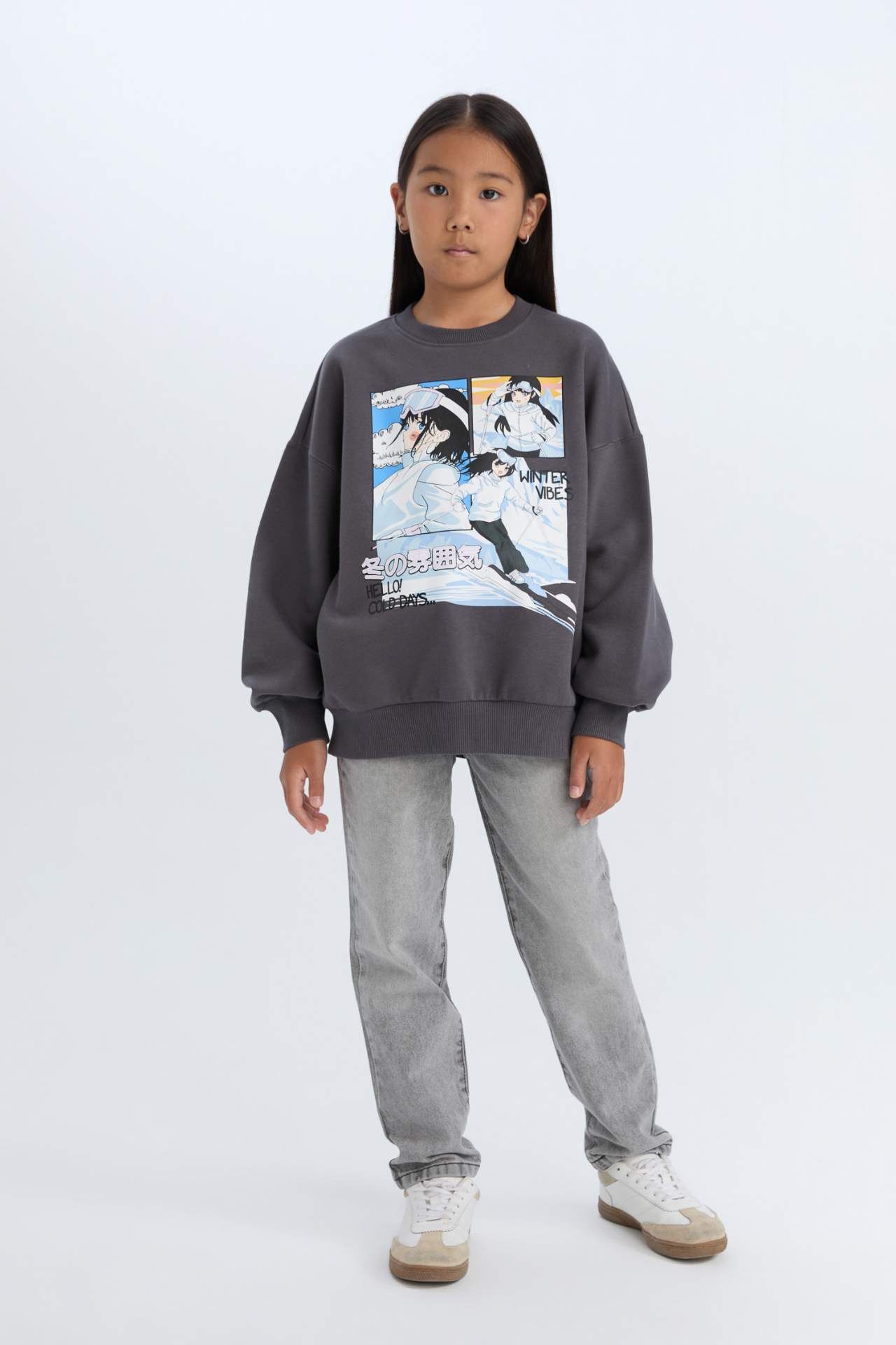DeFacto Kız Çocuk Oversize Geniş Kalıp Bisiklet Yaka Baskılı Sweatshirt D7054A824WNAR148