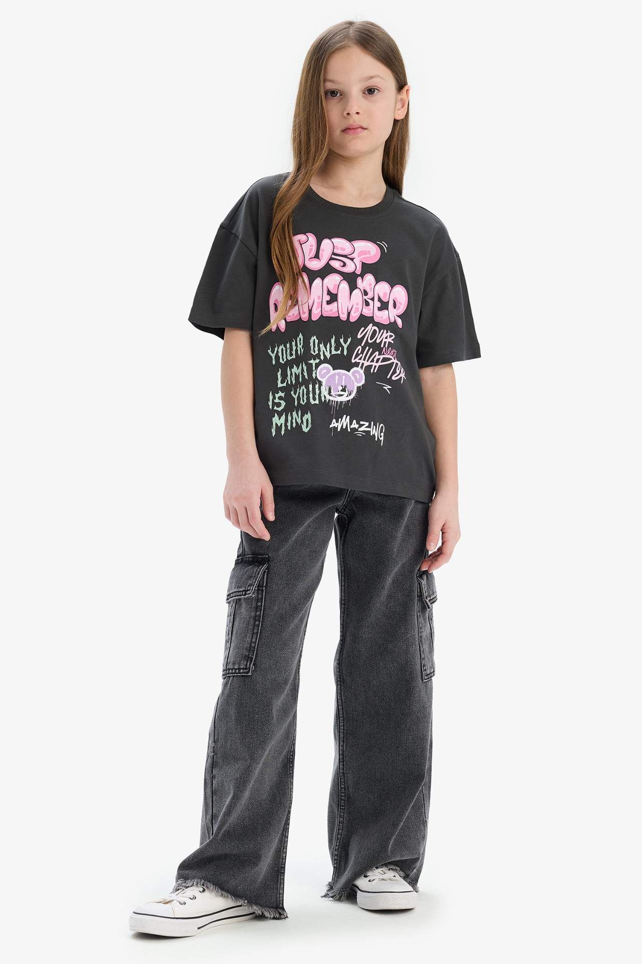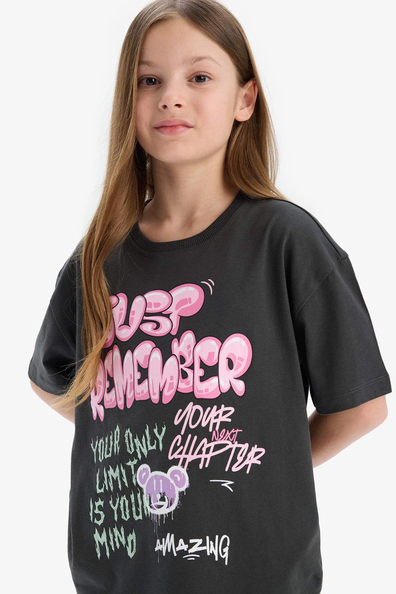 DeFacto Kız Çocuk Oversize Geniş Kalıp Bisiklet Yaka Slogan Baskılı Kısa Kollu Tişört E0356A825SMAR211