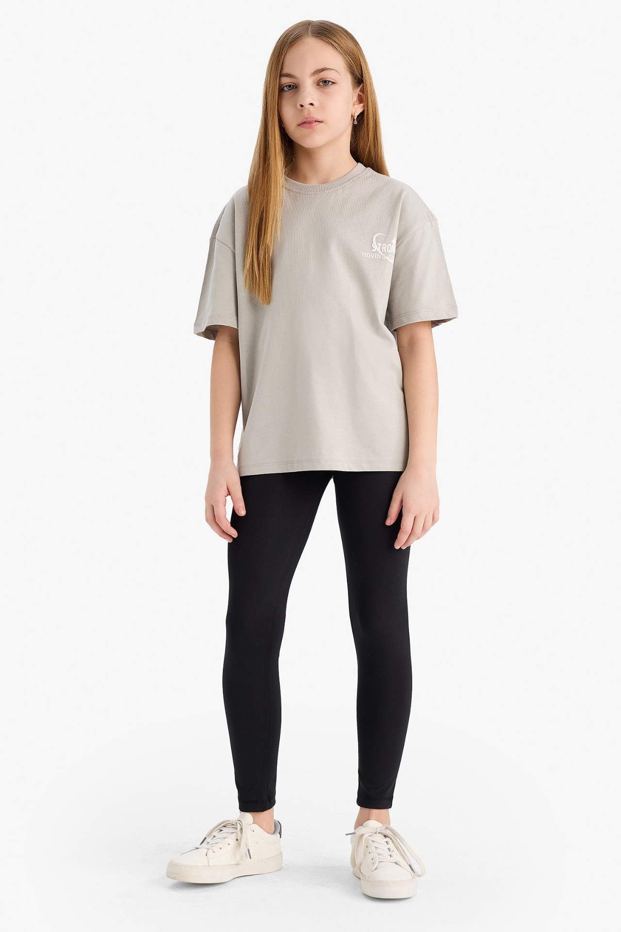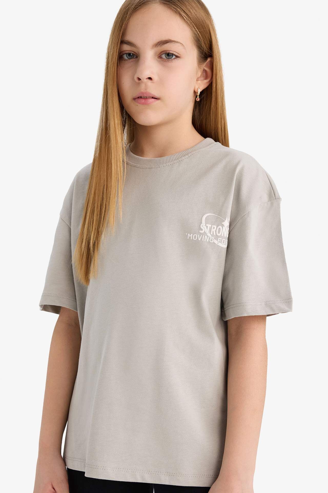 DeFacto Kız Çocuk Oversize Geniş Kalıp Bisiklet Yaka Slogan Baskılı Kısa Kollu Tişört E1044A825SMGR266