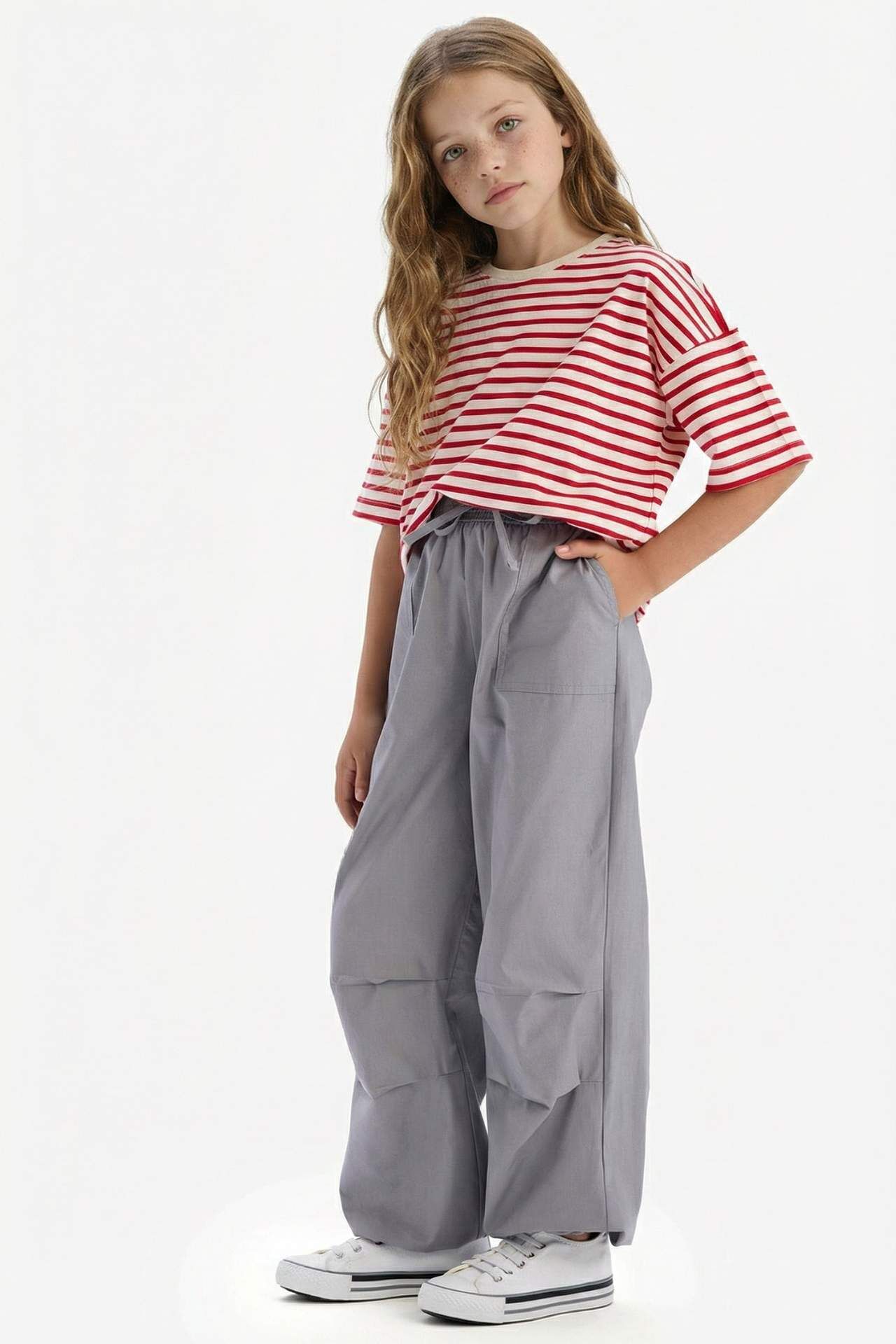 Kız Çocuk Paraşüt Jogger Paça Pamuklu Pantolon, yumuşak pamuk kumaşı ve rahat jogger paça tasarımıyla gün boyu konfor sunar. Hem şık hem de pratik bu pantolon, miniklerin aktif yaşamına uyum sağlar. Pamuk 100%,Pamuk 100%,Pamuk 100%,Pamuk 100%,Pamuk 100%,Pamuk 100% Manken Bedeni: Göğüs: 62 Boy: 1,24 Basen: 73 Bel: 53