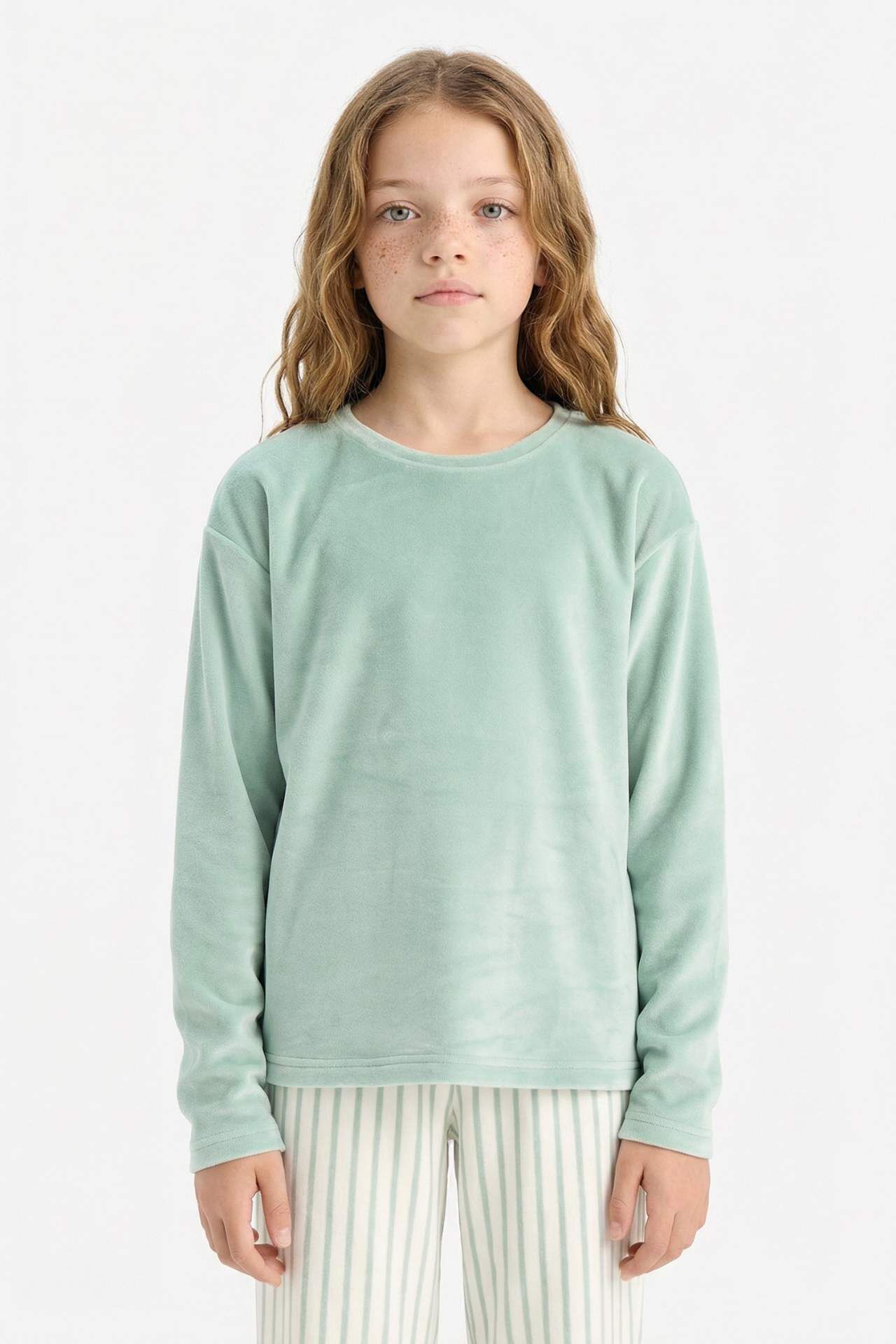 Kız Çocuk Pijama Takımı Polar Uzun Kollu Üst Çizgili Uzun Alt