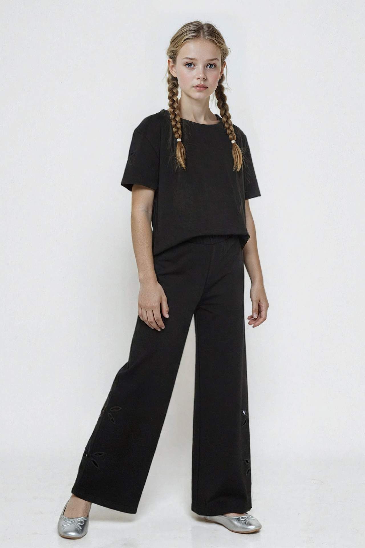 Kız Çocuk Geniş Bol Paça Brode Pantolon, şık brode detayları ve rahat geniş kesimiyle hem zarif hem konforlu bir tercih sunar. Günlük ve özel anlarda şıklığıyla öne çıkar. Pamuk 100%,Pamuk 100%,Pamuk 100%,Pamuk 100%,Pamuk 100%,Pamuk 100%,Pamuk 100%