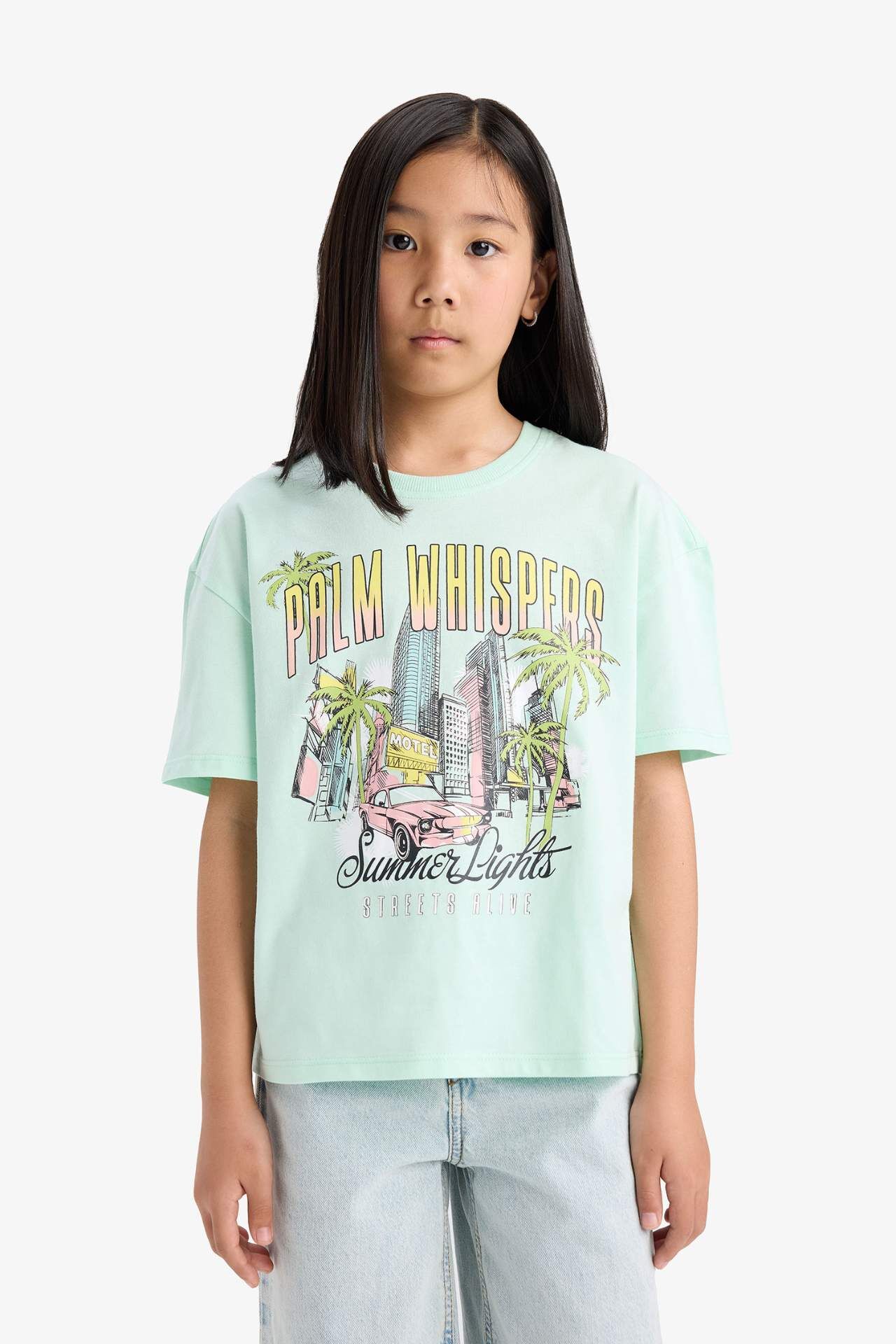 DeFacto Kız Çocuk Relax Fit Bisiklet Yaka Baskılı Kısa Kollu Tişört E0389A825SMTR413