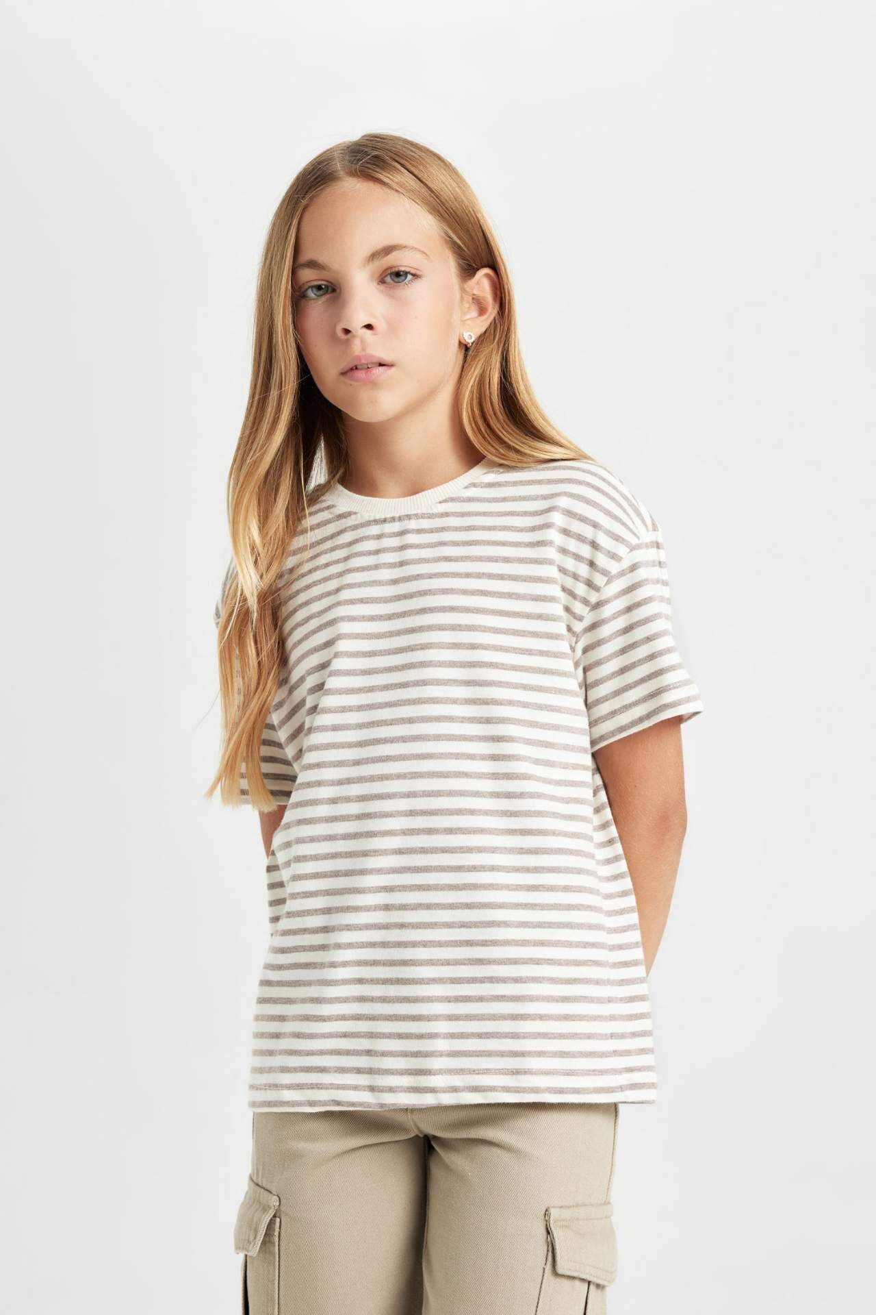 DeFacto Kız Çocuk Relax Fit Bisiklet Yaka Çizgili Kısa Kollu Okul Tişörtü