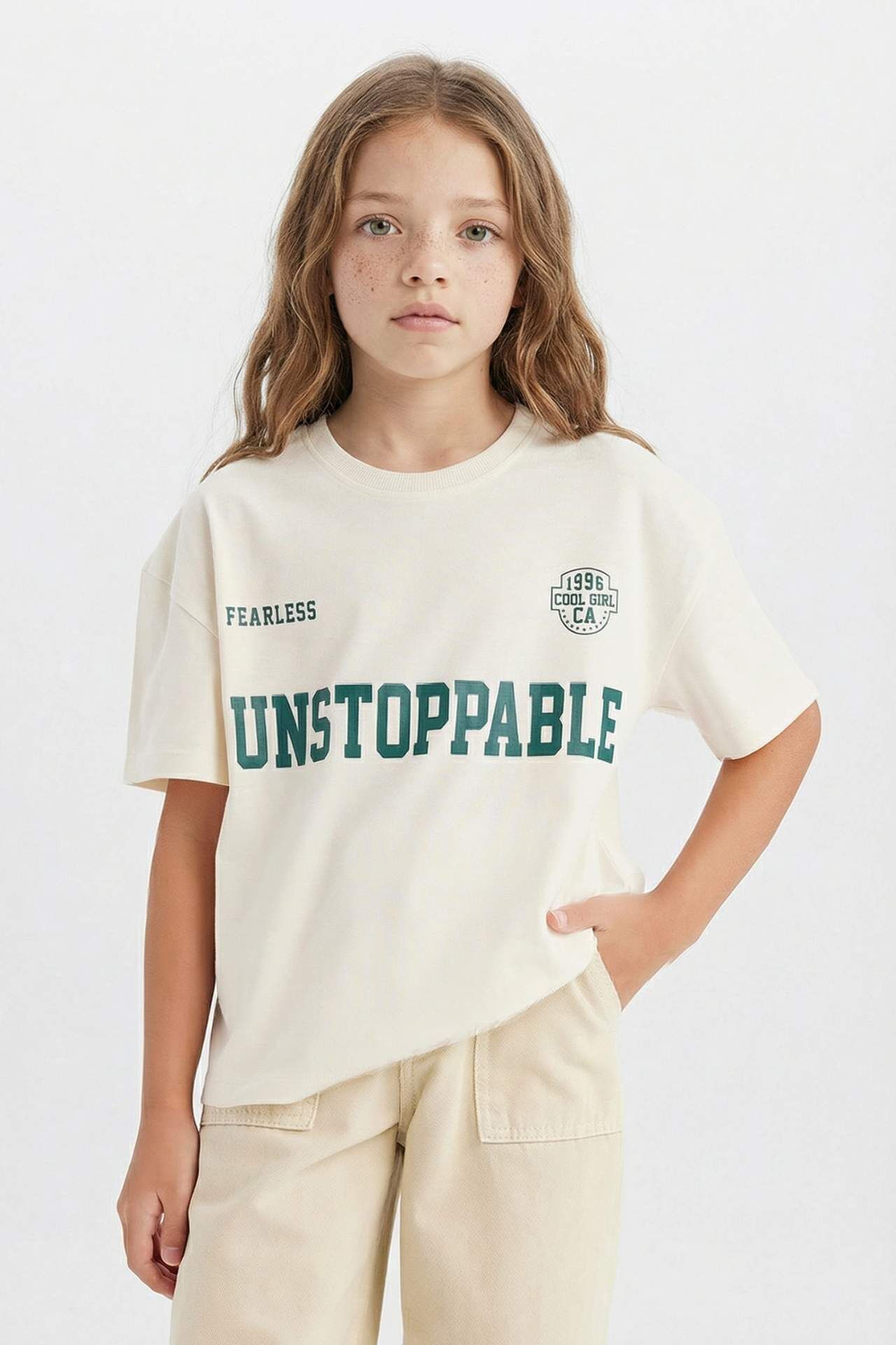 DeFacto Kız Çocuk Relax Fit Bisiklet Yaka Slogan Baskılı Kısa Kollu Tişört D8538A825SMER233
