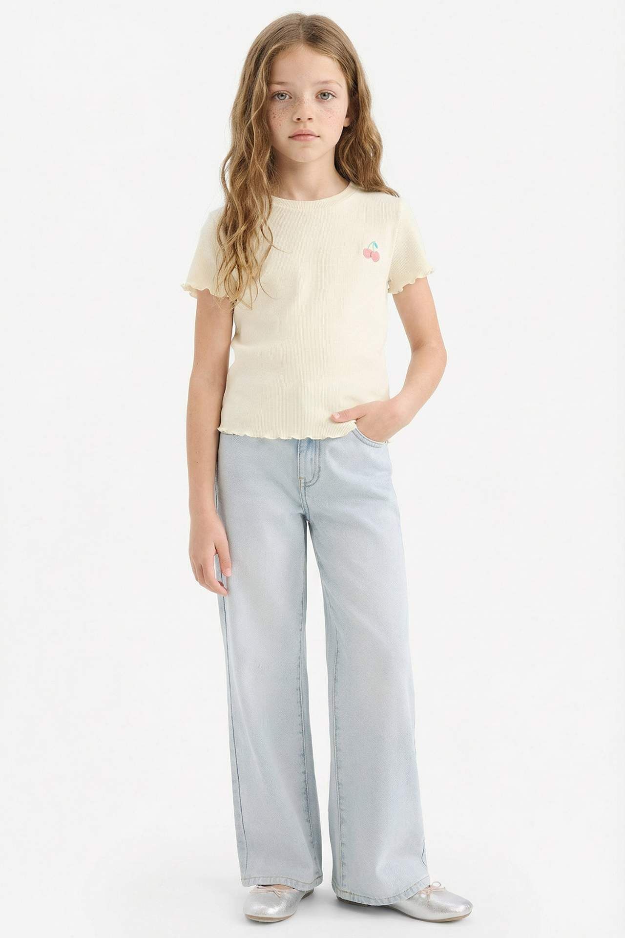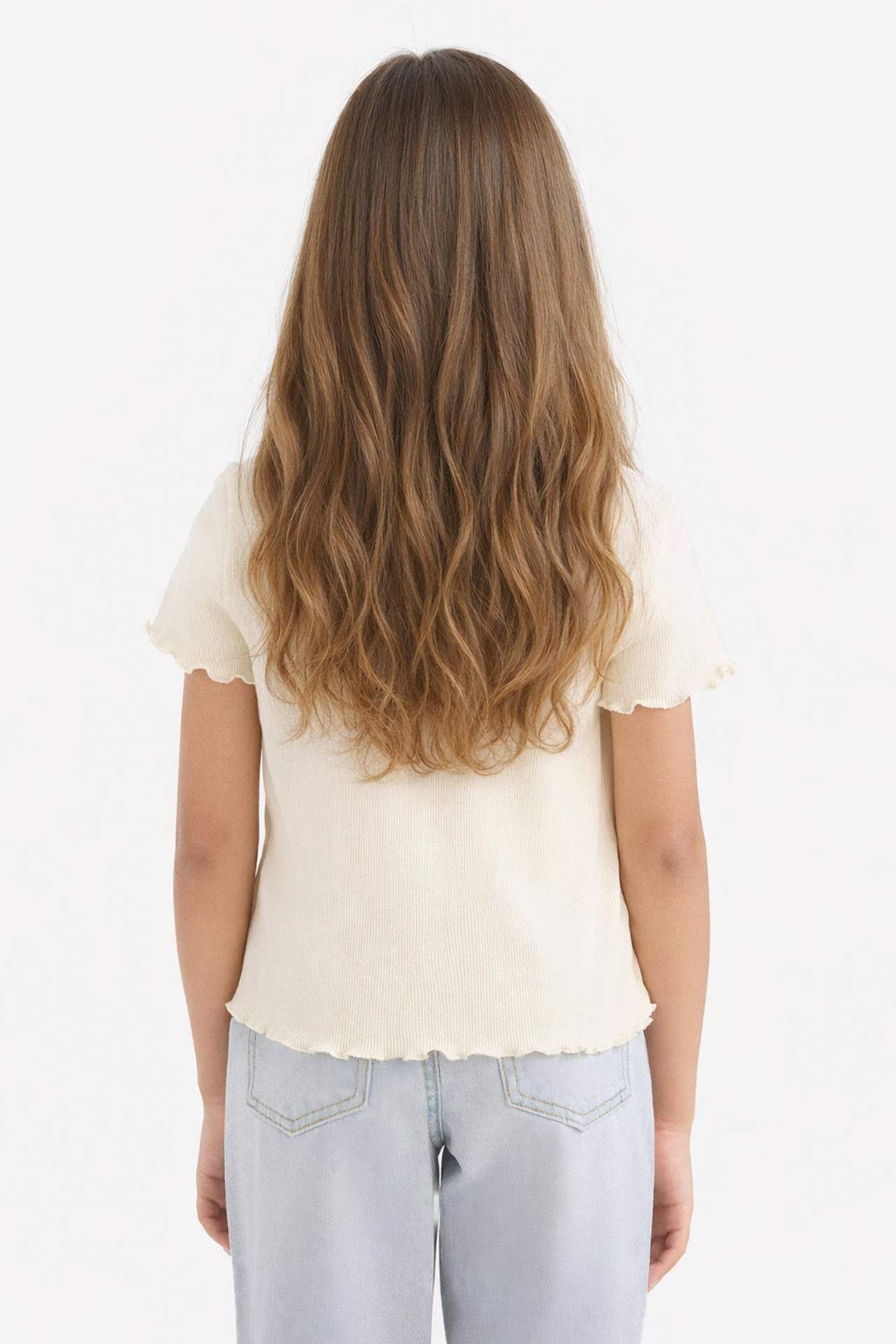 DeFacto Kız Çocuk Slim Fit Dar Kesim Bisiklet Yaka Baskılı Fitilli Kaşkorse Kısa Kollu Tişört D9538A825SMER235