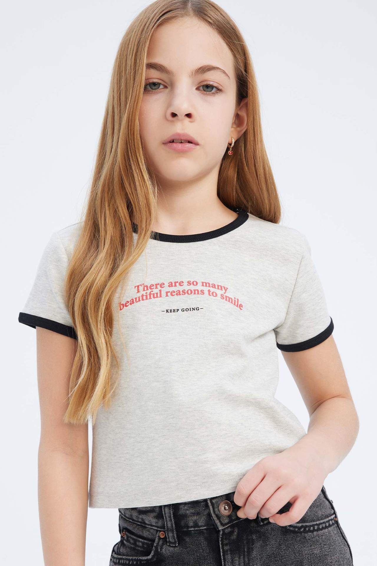 DeFacto Kız Çocuk Slim Fit Dar Kesim Bisiklet Yaka Baskılı Fitilli Kaşkorse Kısa Kollu Tişört E0483A825SPGR379