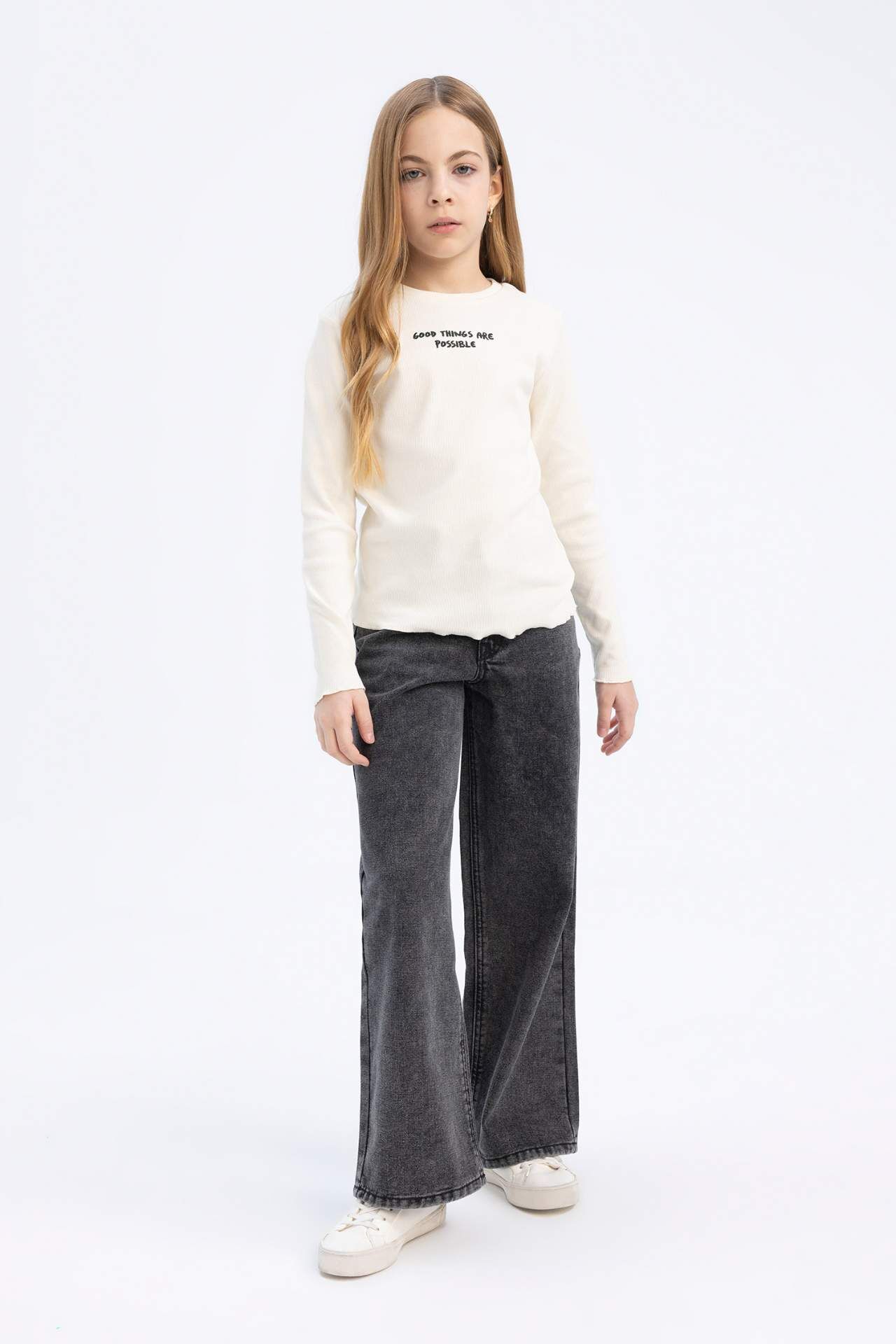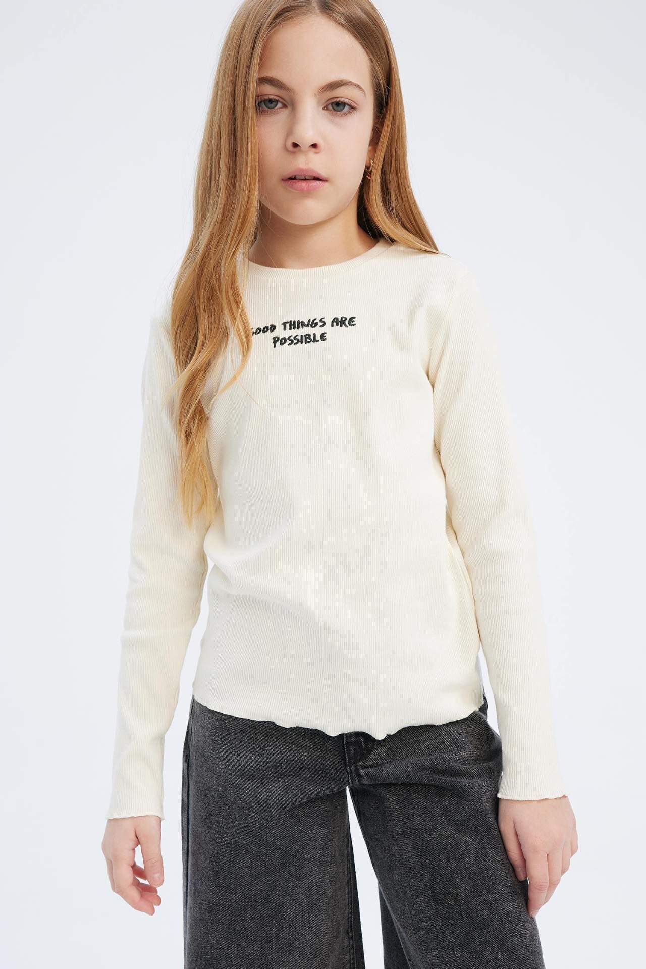DeFacto Kız Çocuk Slim Fit Dar Kesim Bisiklet Yaka Baskılı Fitilli Kaşkorse Uzun Kollu Tişört D8565A825SPER99