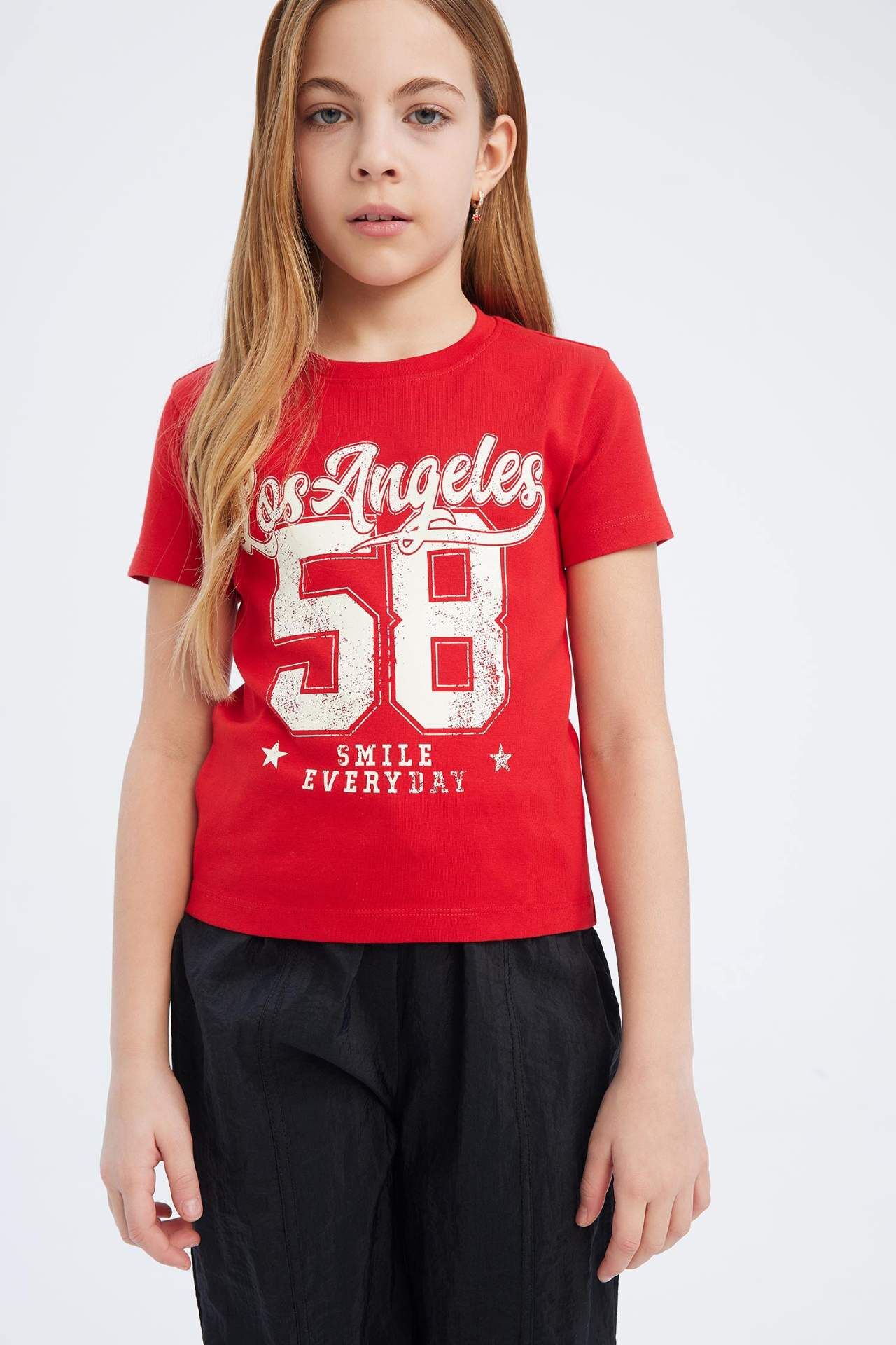 DeFacto Kız Çocuk Slim Fit Dar Kesim Bisiklet Yaka Baskılı Ribana Kısa Kollu Tişört
