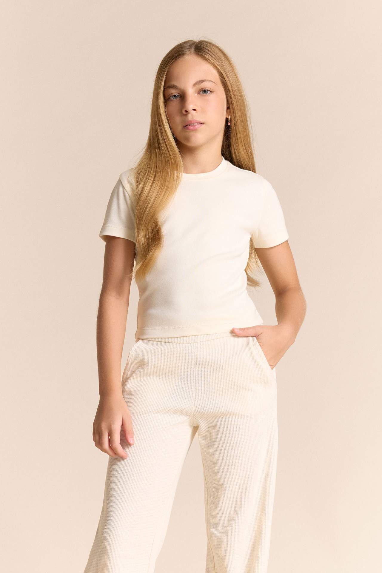 DeFacto Kız Çocuk Slim Fit Dar Kesim Bisiklet Yaka Ribana Basic Düz Kısa Kollu Tişört B3054A825SMER99