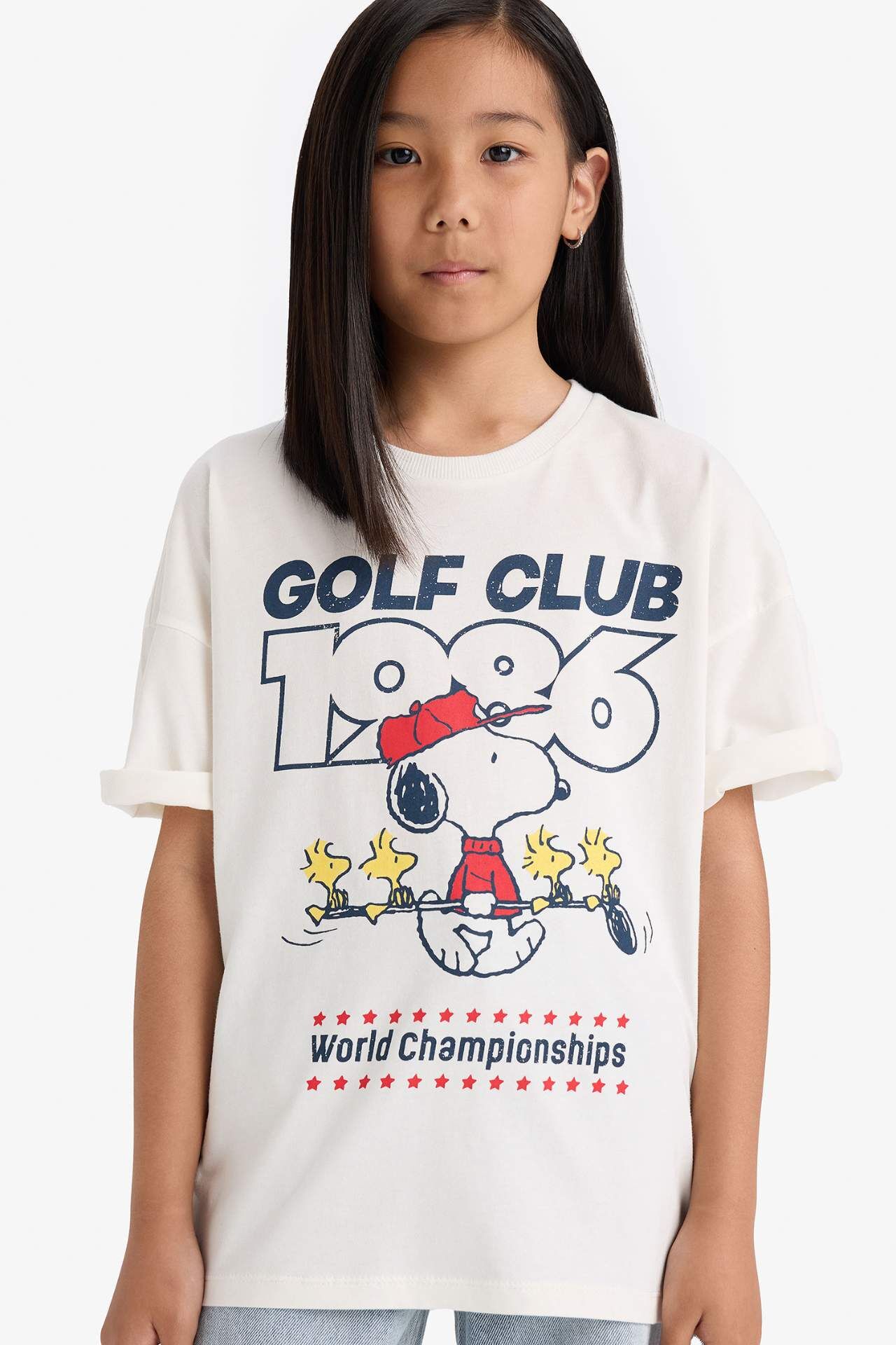 DeFacto Kız Çocuk Snoopy Oversize Geniş Kalıp Bisiklet Yaka Kısa Kollu Tişört E9655A825AUER138